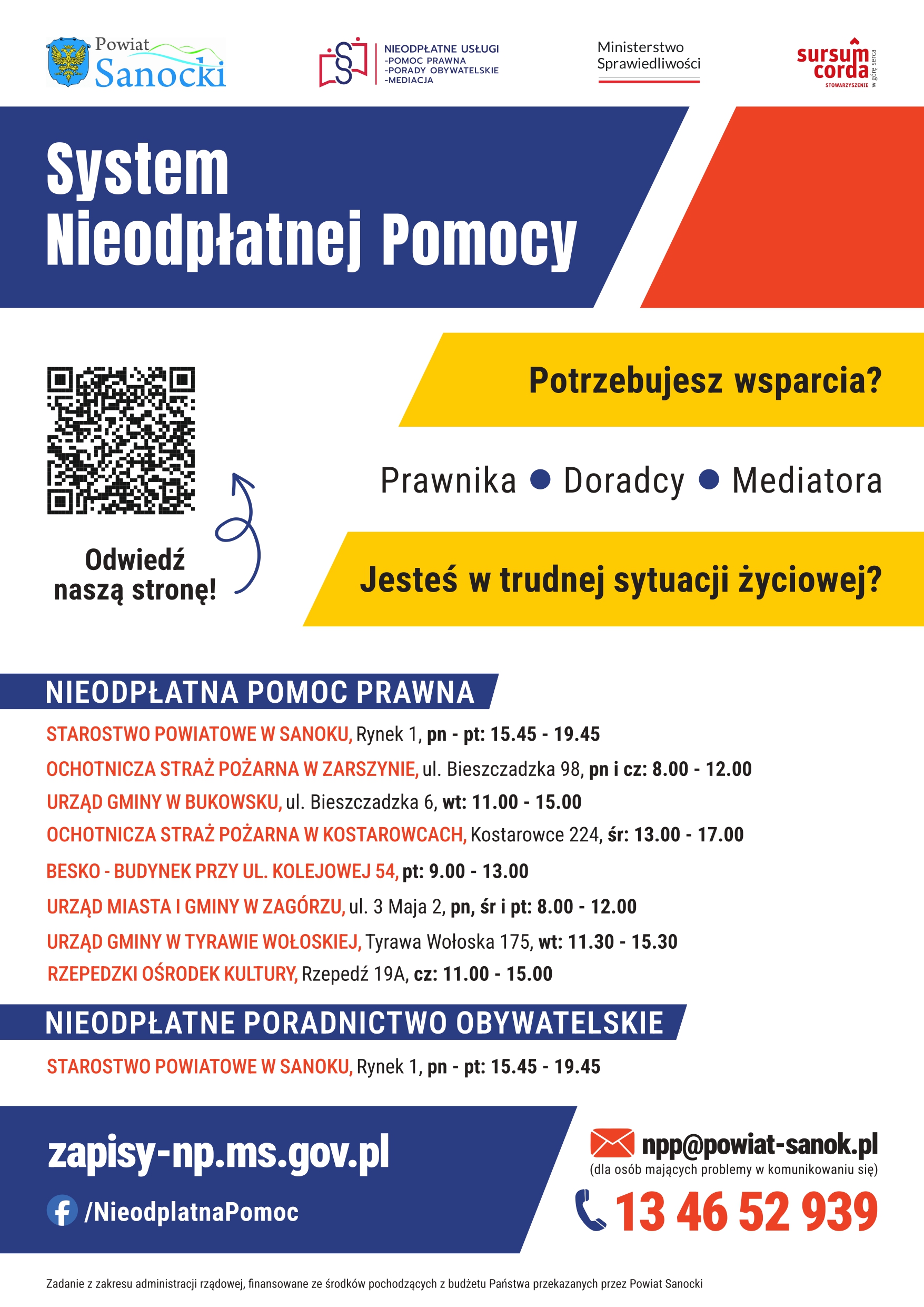 Stowarzyszenie Sursum Corda realizuje projekt powierzony przez POWIAT SANOCKI w ramach którego prowadzi nieodpłatną pomoc prawną, nieodpłatne poradnictwo obywatelskie oraz nieodpłatne mediacje.