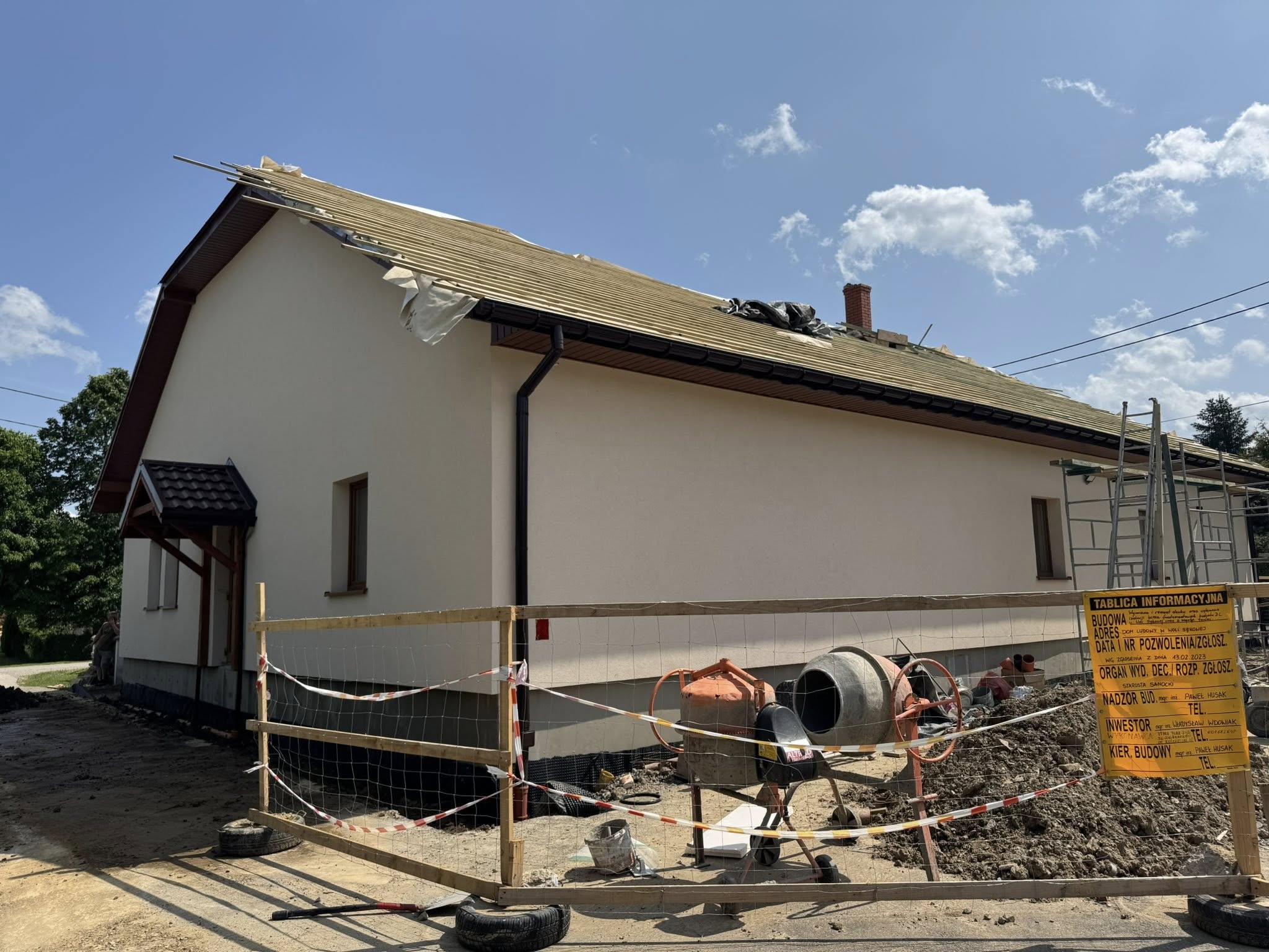 Trwają prace remontowe Domu Ludowego w Woli Sękowej realizowane przez firmę PHU TRAK-BUD S.C, które obejmują wykonanie m.in.: izolację termiczną i przeciwwilgociową ścian fundamentów, płytki odbojowej, wykonanie podjazdu dla osób niepełnosprawnych, wymianę i remont pokrycia dachowego oraz instalacji odgromowej budynku, a także dostawę i montaż interaktywnej ławki audiobench.