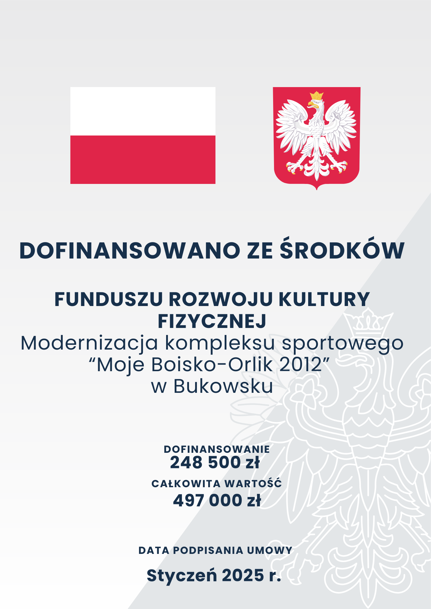 Na realizację tego zadania inwestycyjnego gmina Bukowsko otrzymała dofinansowanie w kwocie 248 500 zł ze środków Funduszu Rozwoju Kultury Fizycznej z Ministerstwa Sportu i Turystyki.
