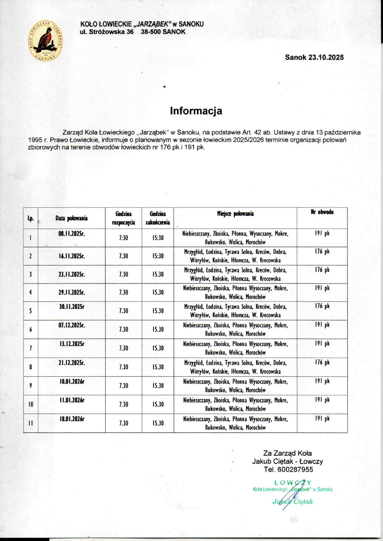 Uwaga polowanie !!! Plan polowań zbiorowych Koła Łowieckiego "Jarząbek" w Sanoku na sezon łowiecki 2025/2026 r.