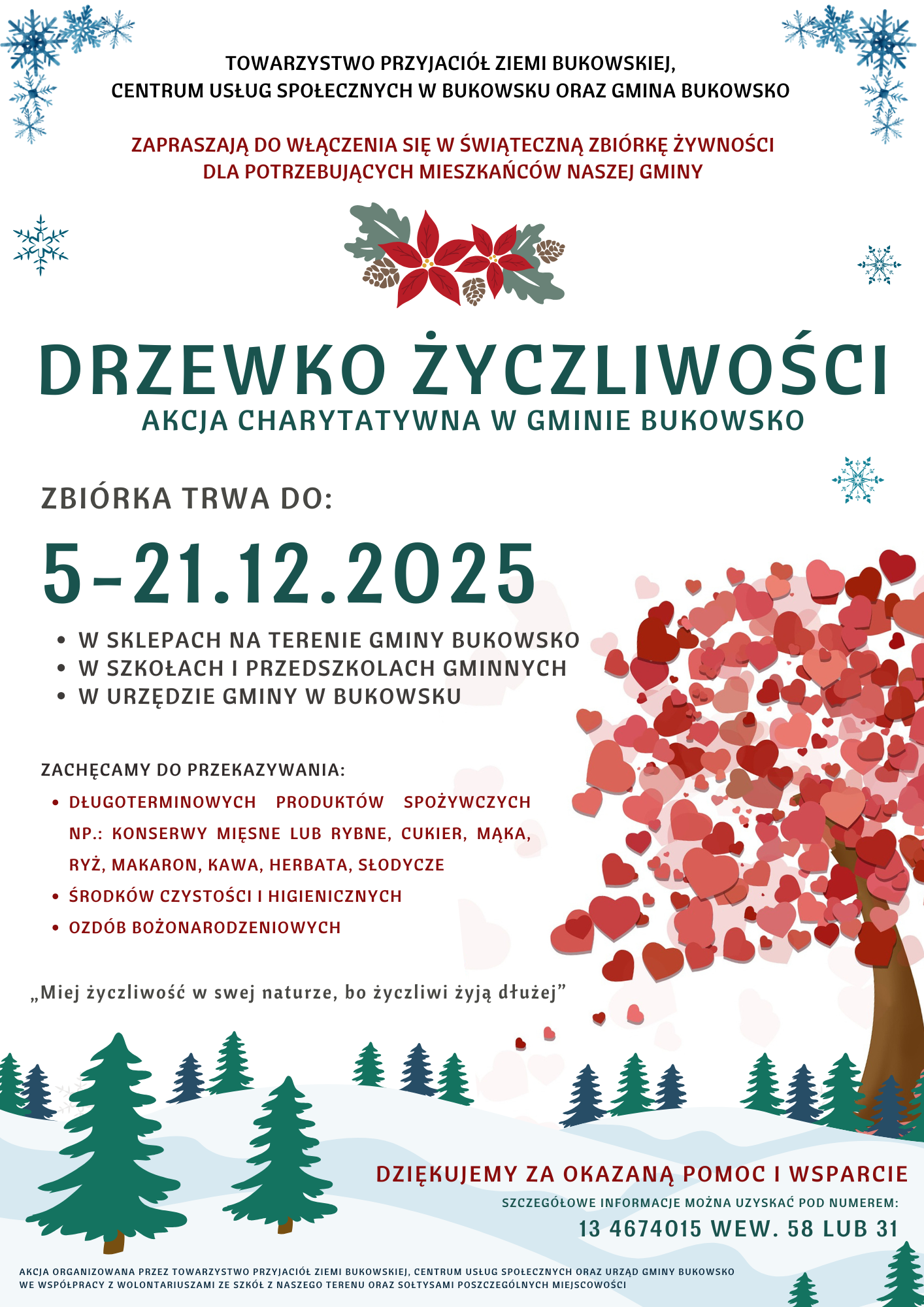 Serdecznie zapraszamy Was do włączenia się ponownie w przedświąteczną akcję charytatywną „Drzewko Życzliwości”, której celem jest niesienie dobra, integracja naszej lokalnej społeczności oraz wsparcie osób potrzebujących z terenu gminy Bukowsko.
