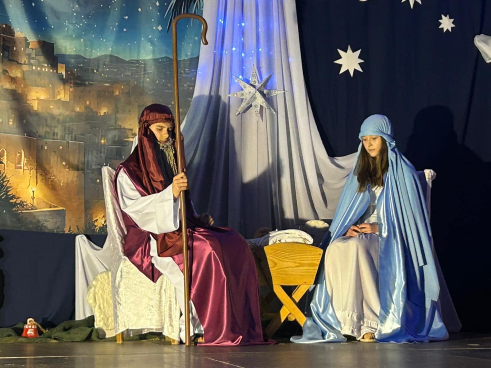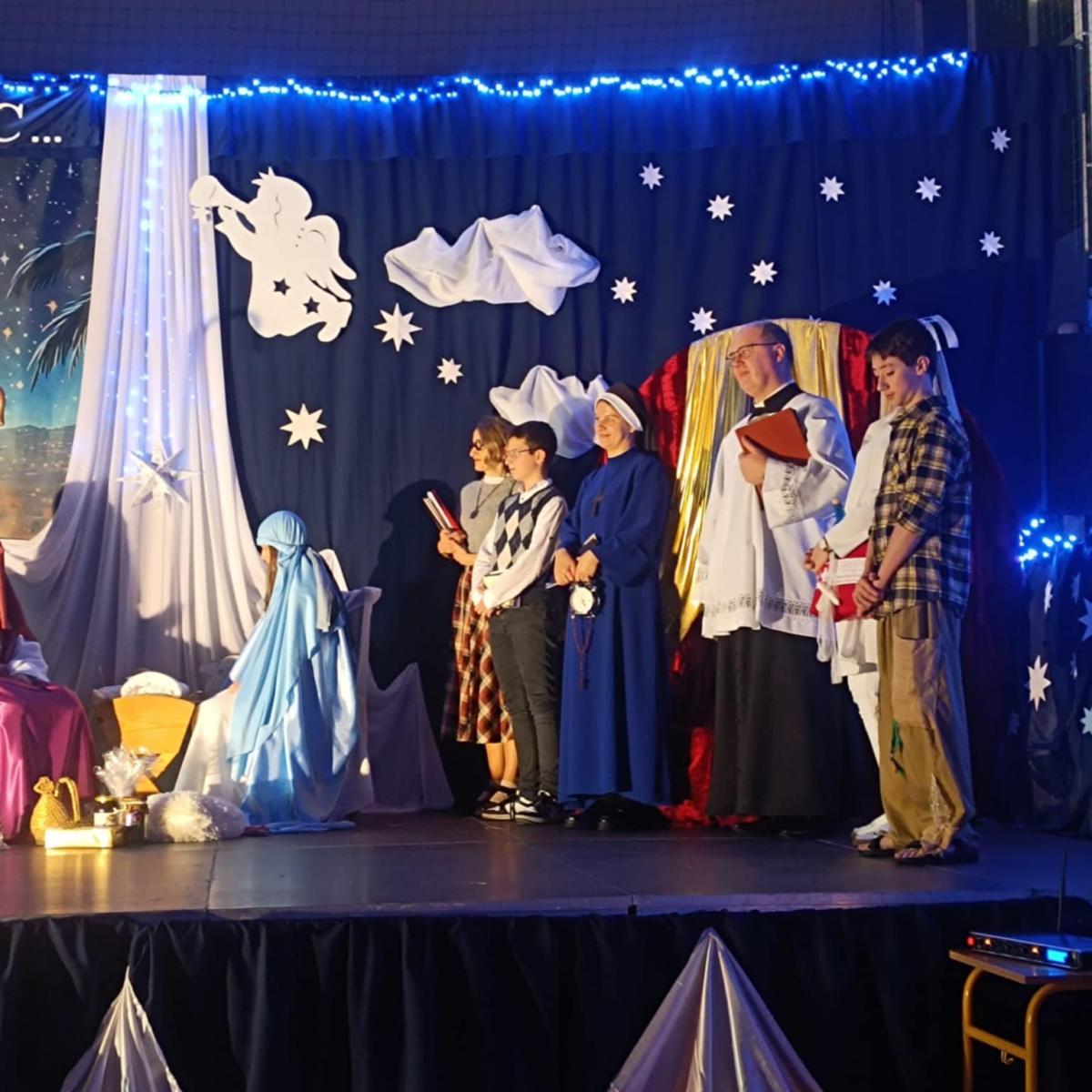 W pierwszej części spektaklu uczniowie odtworzyli wydarzenia sprzed ponad dwóch tysięcy lat, kiedy to w Betlejem narodziło się Dzieciątko Jezus. Dzieci wcieliły się w role Maryi i Józefa, aniołów, pasterzy oraz królów przybywających złożyć pokłon Jezusowi narodzonemu w ubogiej stajence, była także śmierć i psotne diabły.