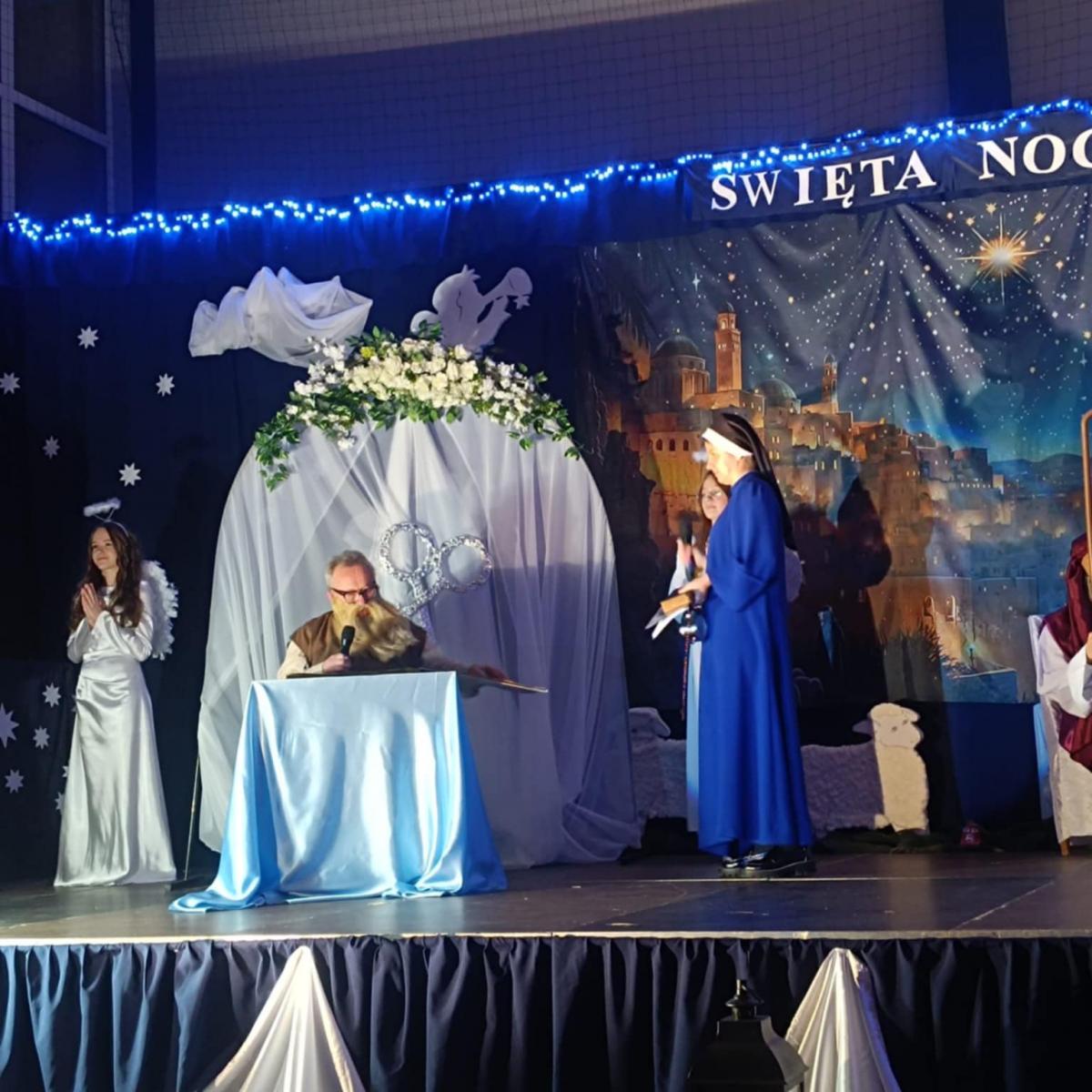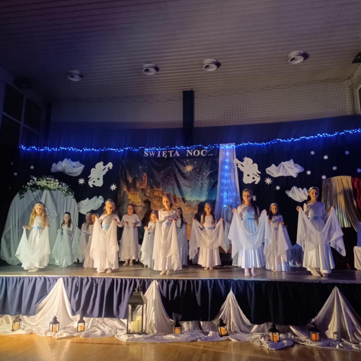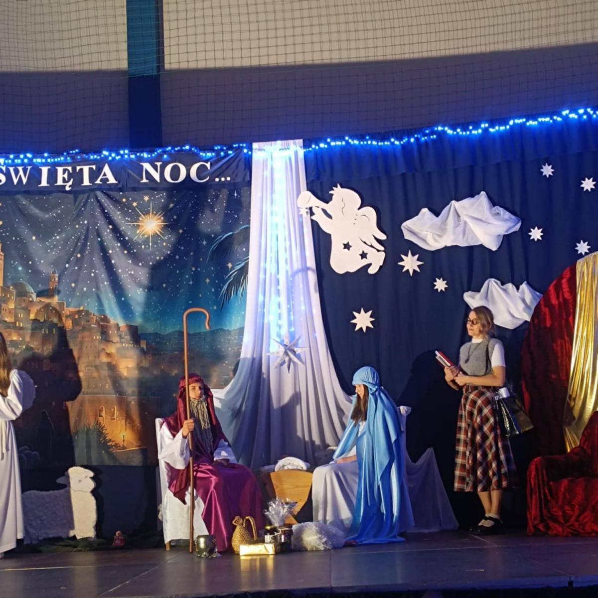 Całość przedstawienia, pokazująca scenki z życia nowonarodzonego Dzieciątka, pasterzy, mędrców, przeplatana była kolędami i pastorałkami. Tańce uwielbienia dla Nowonarodzonego wykonali uczniowie klasy I, II i VI pod opieką p. Bożeny Skubisz i p. Mariusza Prajznera. O dobrą zabawę i miłe doznania słuchowe zadbali zdolni aktorzy z klasy IV, V, VI, VII, VIII oraz szkolny chór pod opieką p. Lesława Pyrcaka.