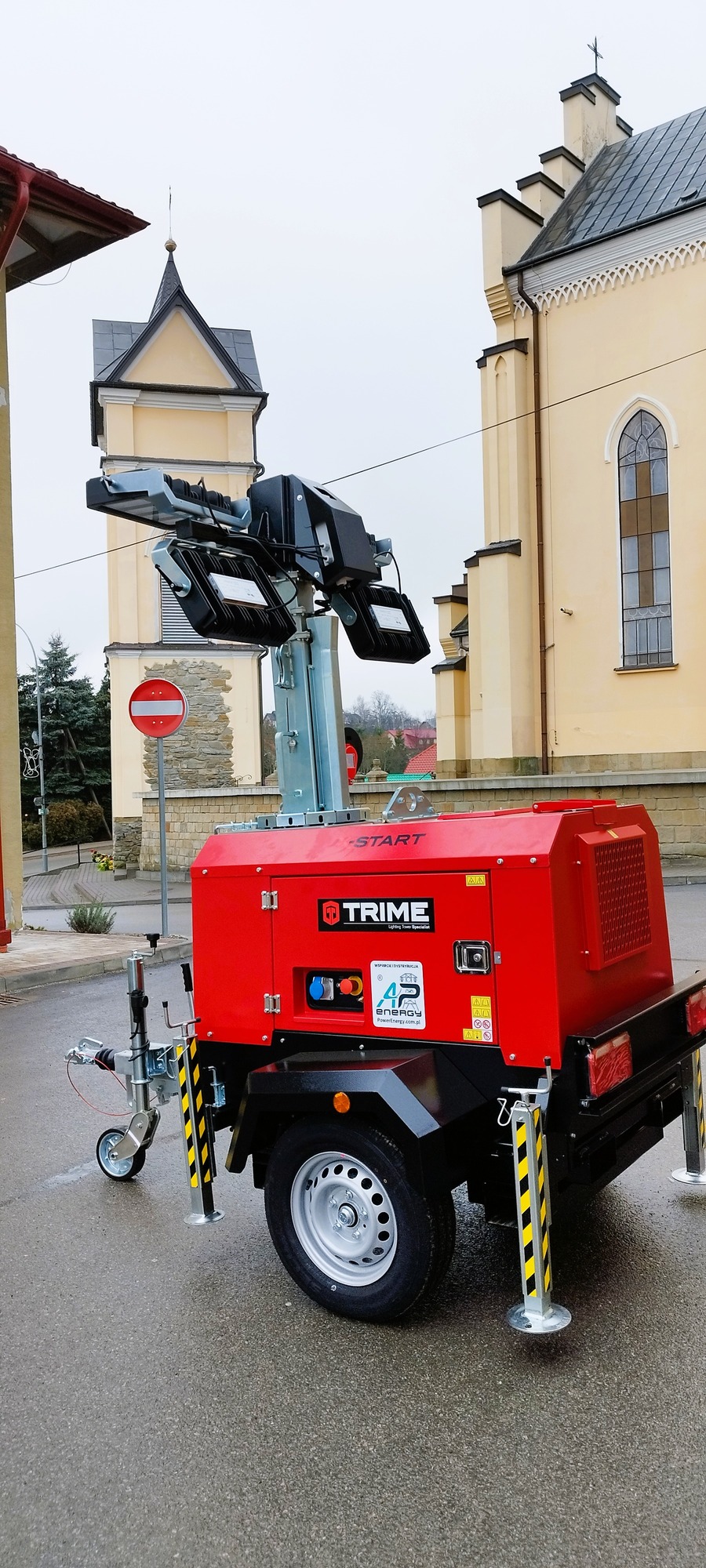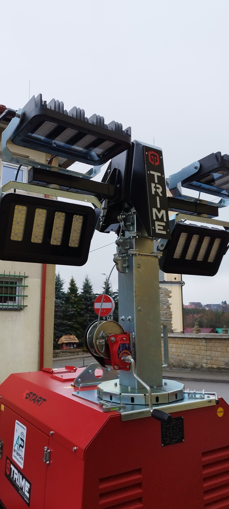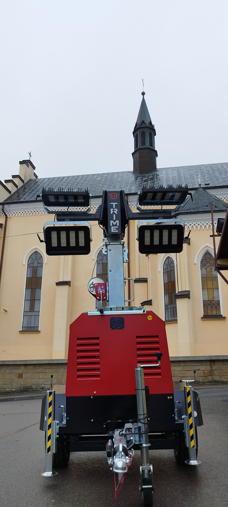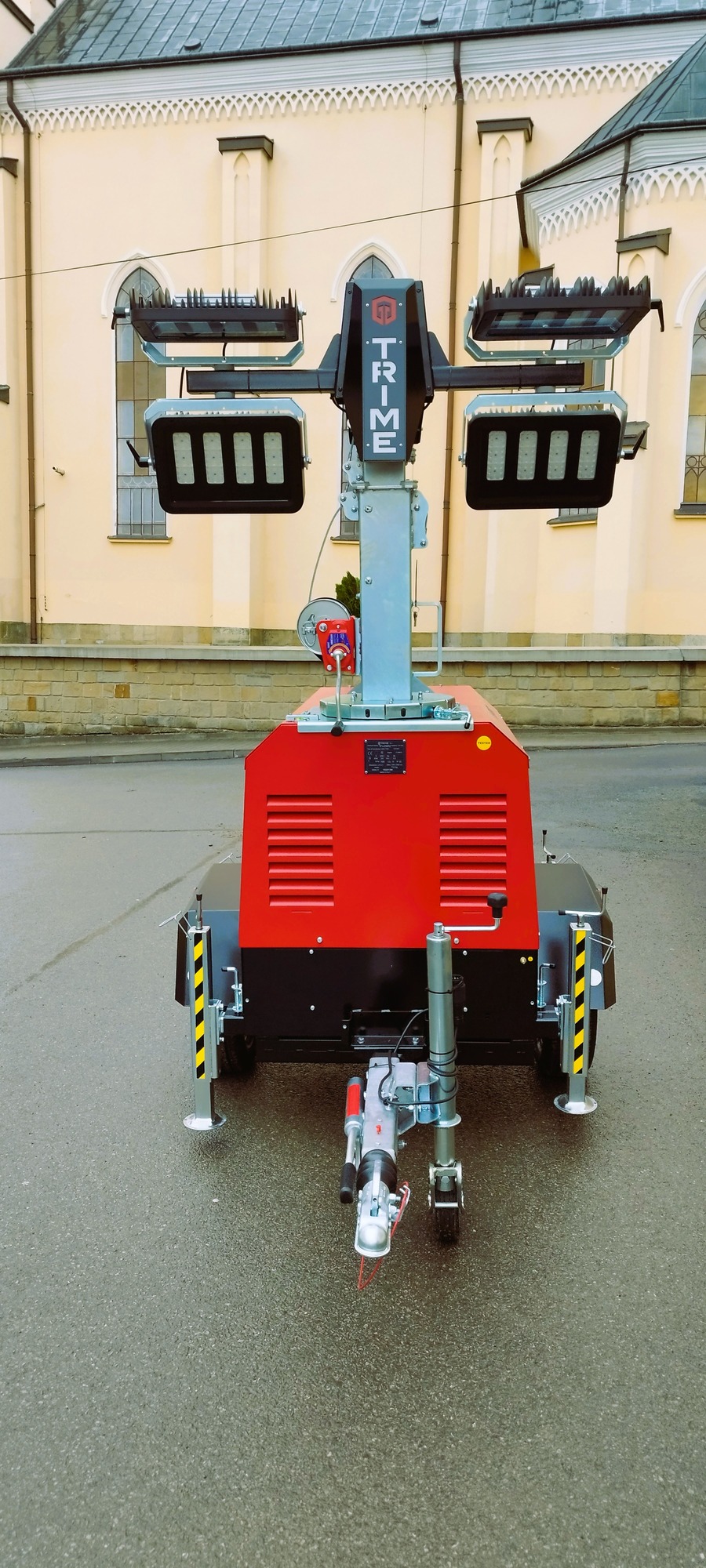 3. Mobilny maszt oświetleniowy z agregatem prądotwórczym, zamontowany na przyczepie, wyposażony w agregat, celem umożliwienia skutecznego oświetlenia obszarów dotkniętych kryzysami, podczas akcji pomocowych.