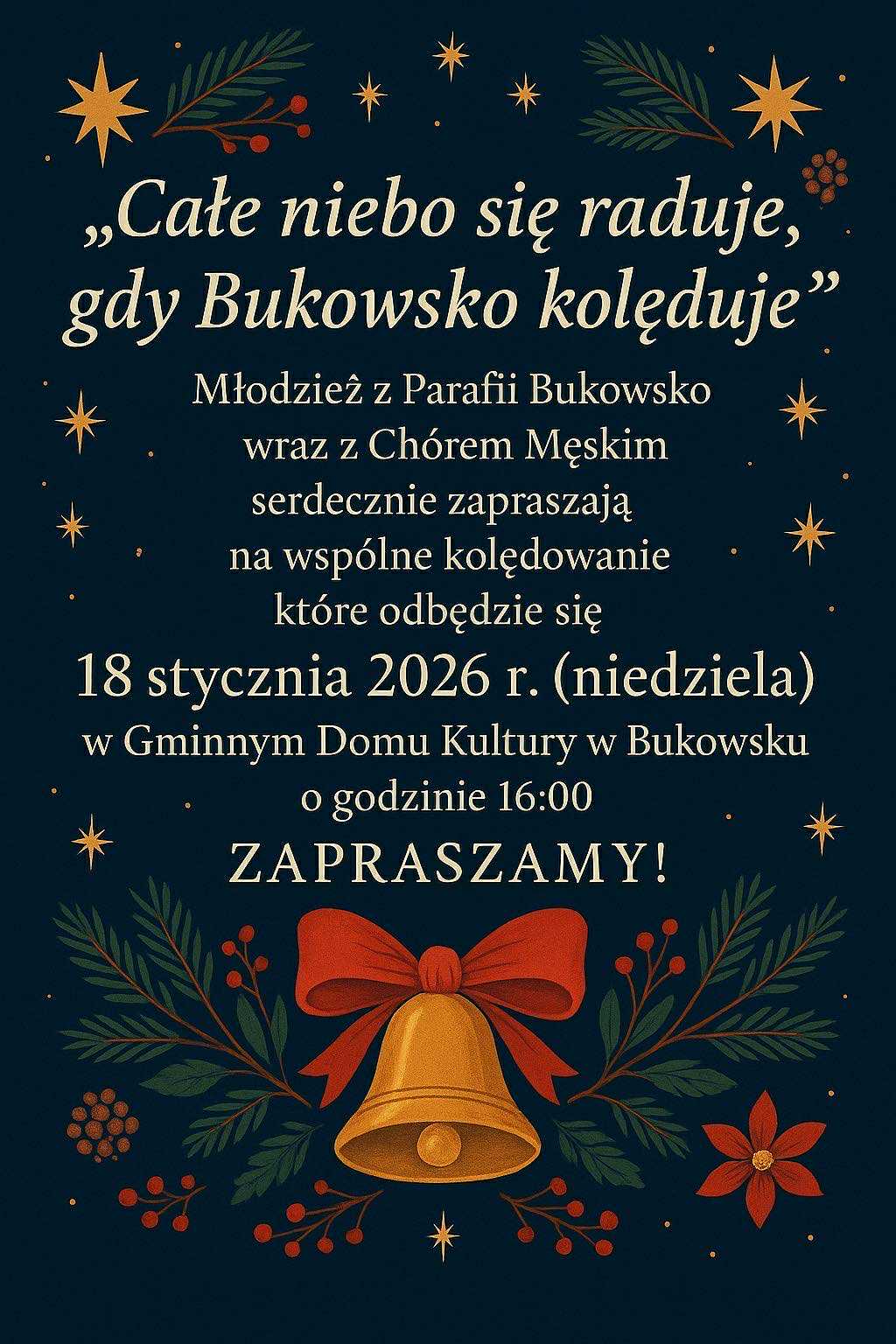 Serdecznie zapraszamy mieszkańców Gminy Bukowsko oraz gości na wspólne kolędowanie, które odbędzie się pod hasłem „Całe niebo się raduje, gdy Bukowsko kolęduje”.