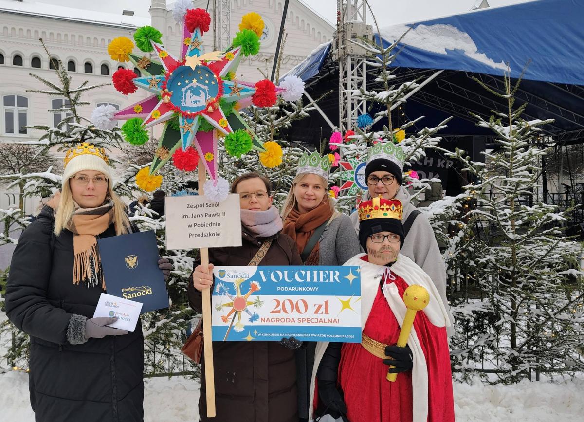 Delegacja z przedszkola Zespołu Szkół w Pobiednie zaprezentowała własnoręcznie wykonaną gwiazdę, przygotowaną z ogromnym zaangażowaniem i dbałością o detale. Choć tym razem nie udało się sięgnąć po najwyższe miejsce na podium, praca zachwyciła jurorów i została uhonorowana wyróżnieniem. Szczególne wkład w wykonanie gwiazy miała pani M. Konik.