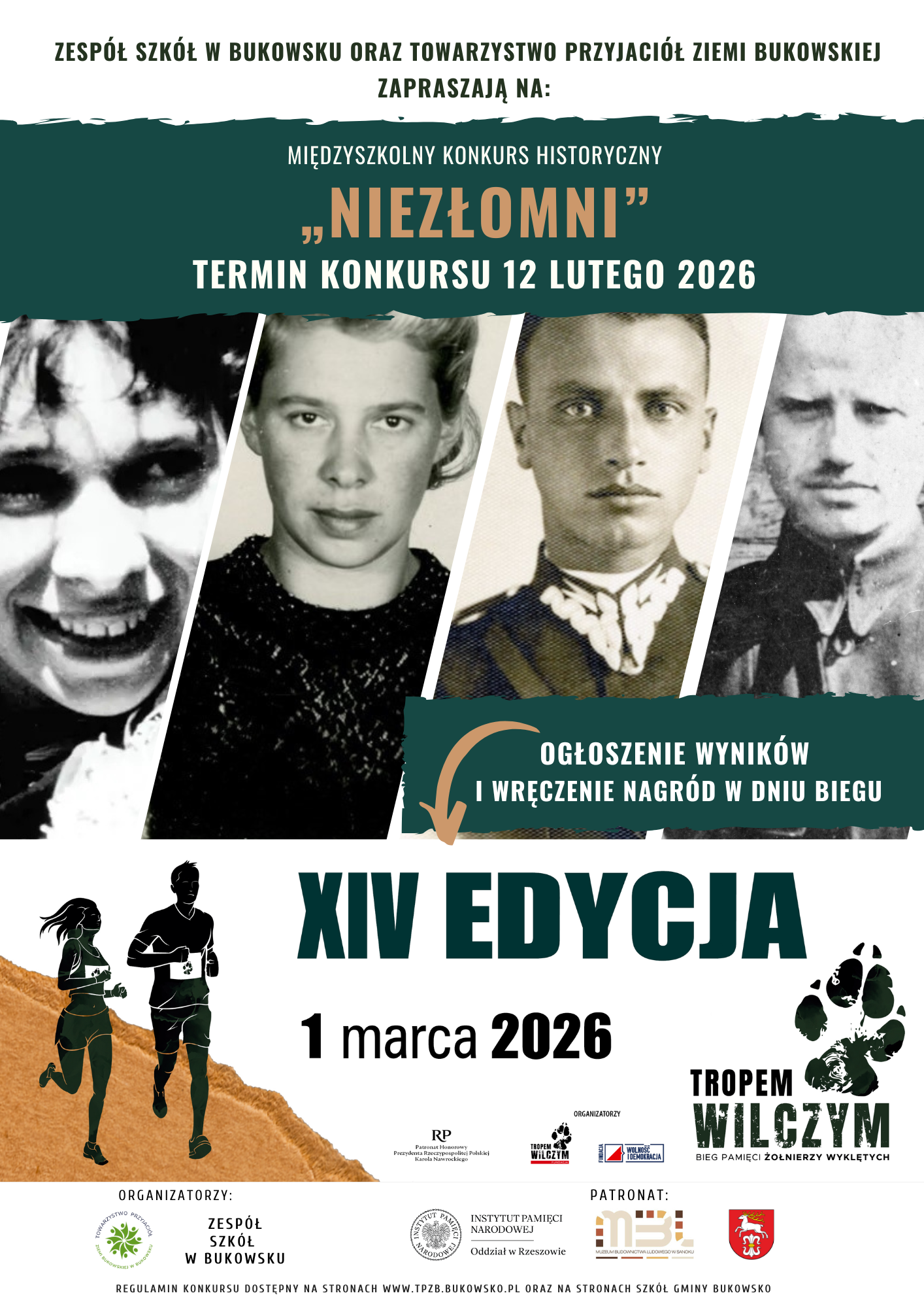 Jak co roku wraz z Towarzystwem Przyjaciół Ziemi Bukowskiej serdecznie zapraszamy młodzież ze szkół gminy Bukowsko do udziału w międzyszkolnym konkursie historycznym "Niezłomni". W tym roku ze względu na termin biegu przypadającego dokładnie w dniu obchodów Narodowego Dnia Pamięci Żołnierzy Wyklętych zapraszamy szkoły również do przygotowania wielkoformatowego plakatu poświęconego Żołnierzom Wyklętym.