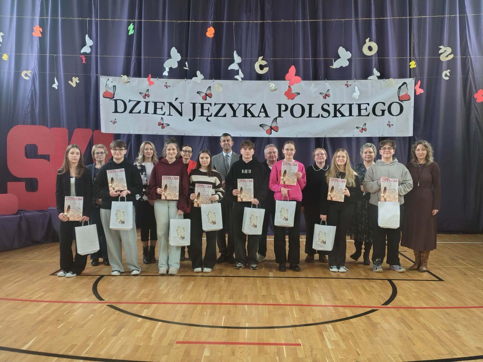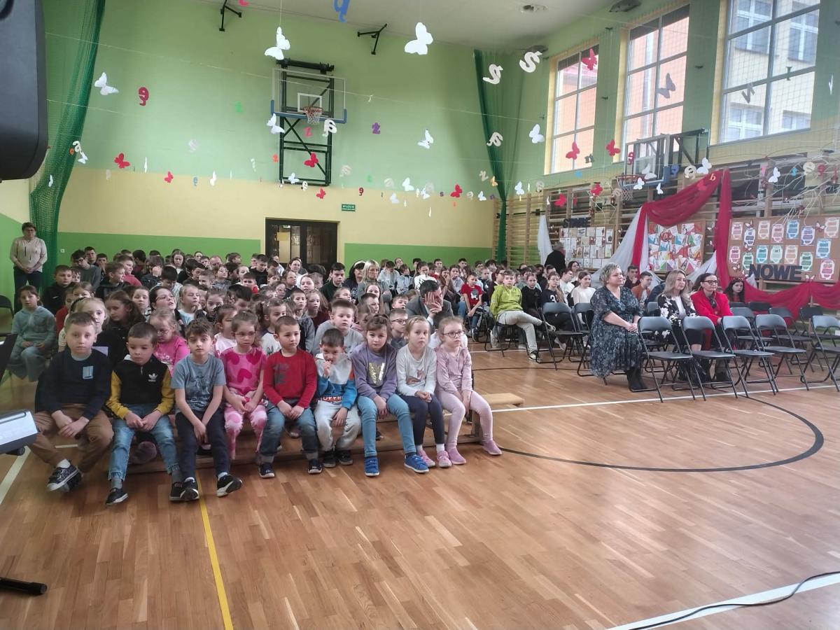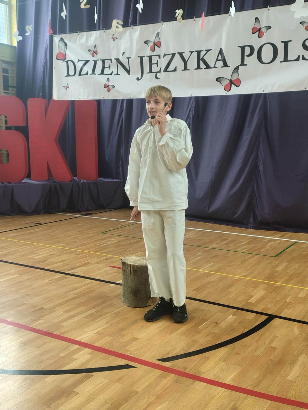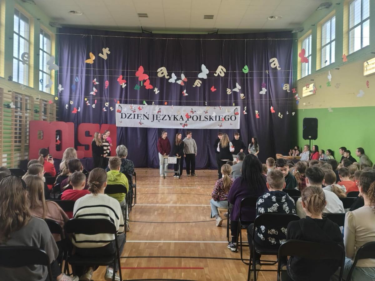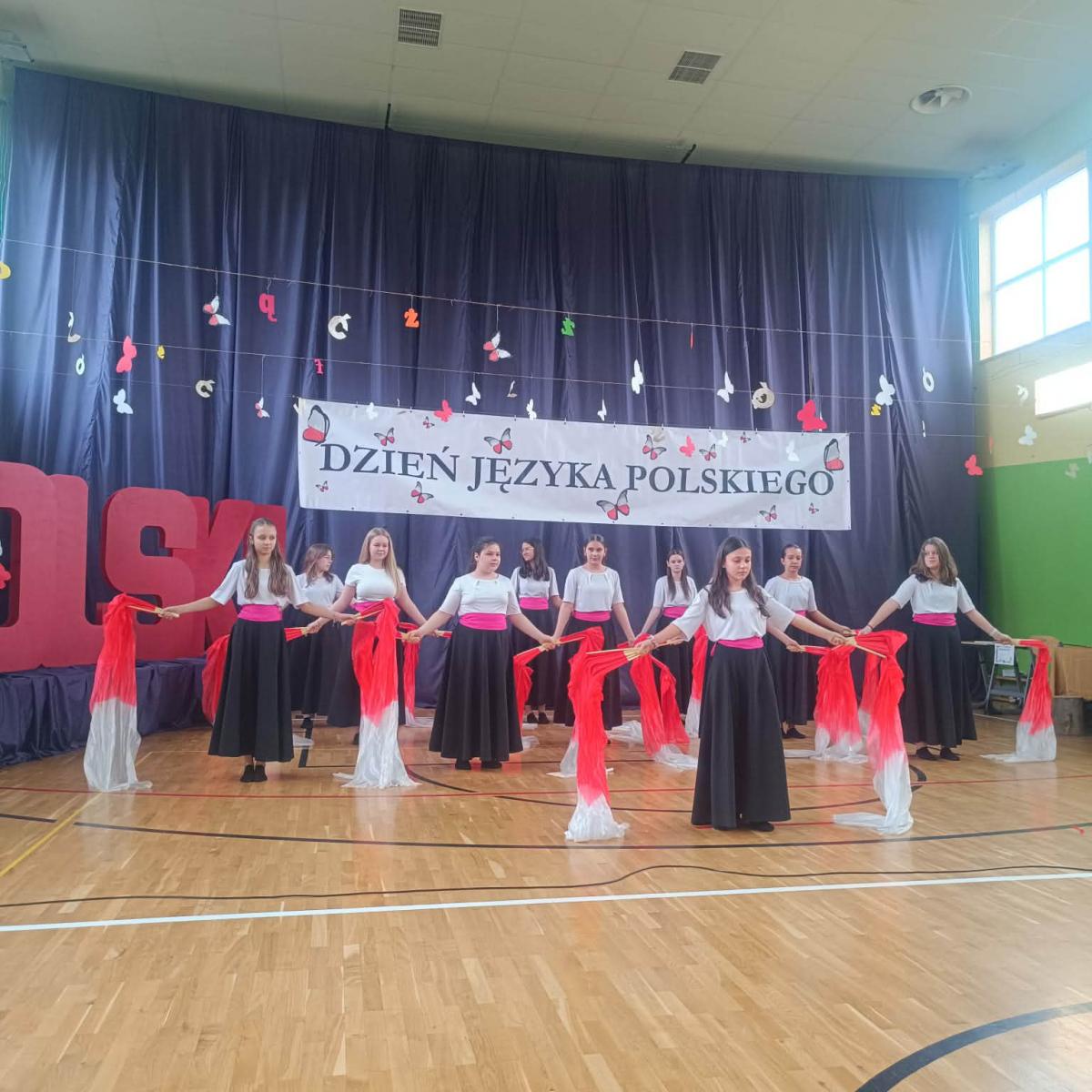 Program artystyczny był niezwykle różnorodny. Uczniowie klasy IV z powodzeniem zaprezentowali piosenkę „Żółta żaba żarła żur”, udowadniając, że językowe łamańce mogą być nie tylko wyzwaniem, ale również źródłem dobrej zabawy. Publiczność obejrzała także kabaretowy skecz „Jadłopodawca” oraz humorystyczne przedstawienie „Ach ta dzisiejsza młodzież”, które z przymrużeniem oka ukazało zmiany w sposobie komunikowania się kolejnych pokoleń. Nie zabrakło również występów muzycznych, w tym utworów „Dykcja”, „Łamaniec” oraz interpretacji wiersza „Nic dwa razy”, podkreślających piękno i melodyjność języka polskiego. Zwieńczeniem części artystycznej był efektowny taniec z wachlarzami do utworu „Victory” w wykonaniu uczennic klasy VI.