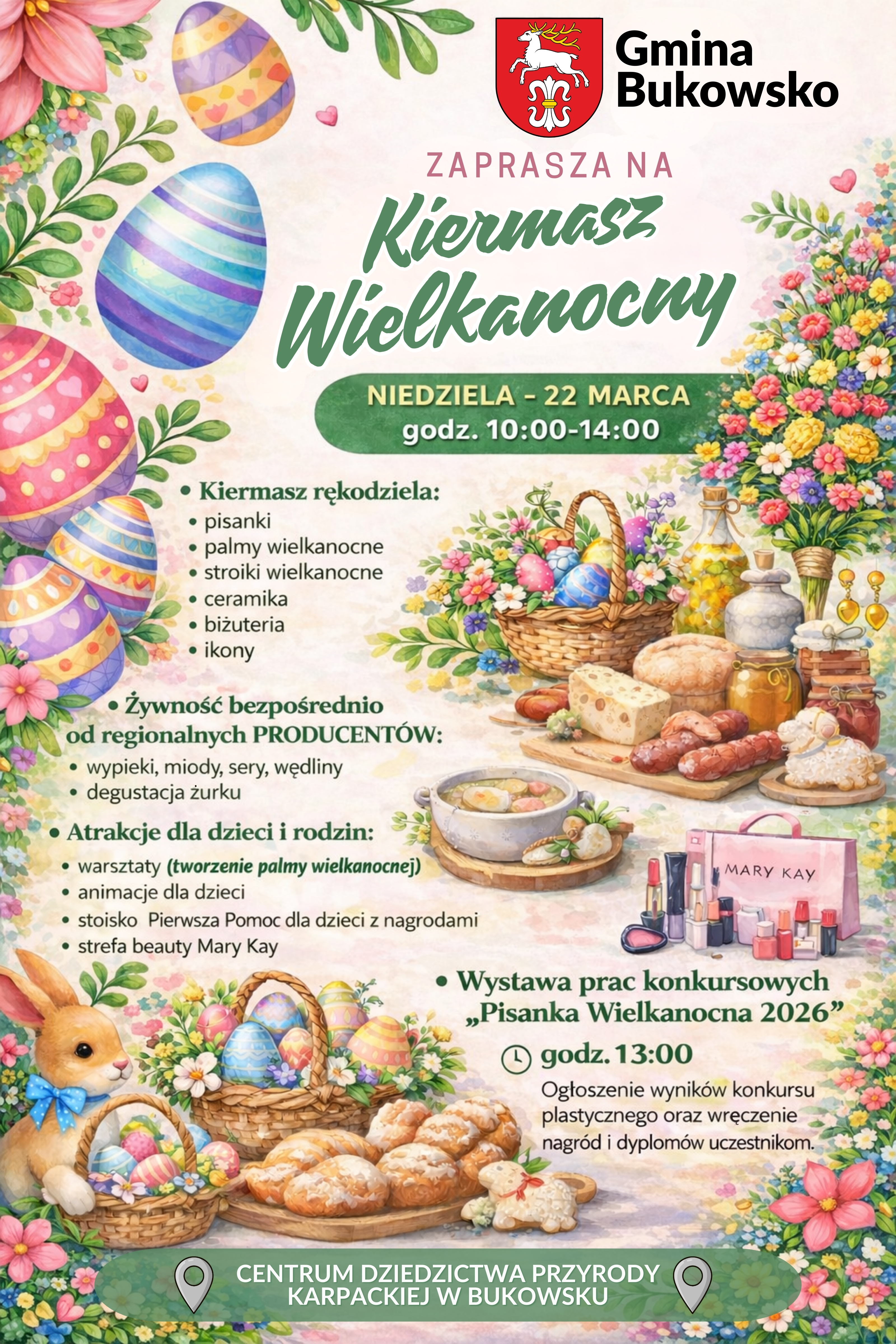 Serdecznie zapraszamy mieszkańców oraz gości do udziału w Kiermaszu Wielkanocnym, który odbędzie się 22 marca 2026 r. w godz. 10:00–14:00 na placu Centrum Dziedzictwa Przyrody Karpackiej w Bukowsku.