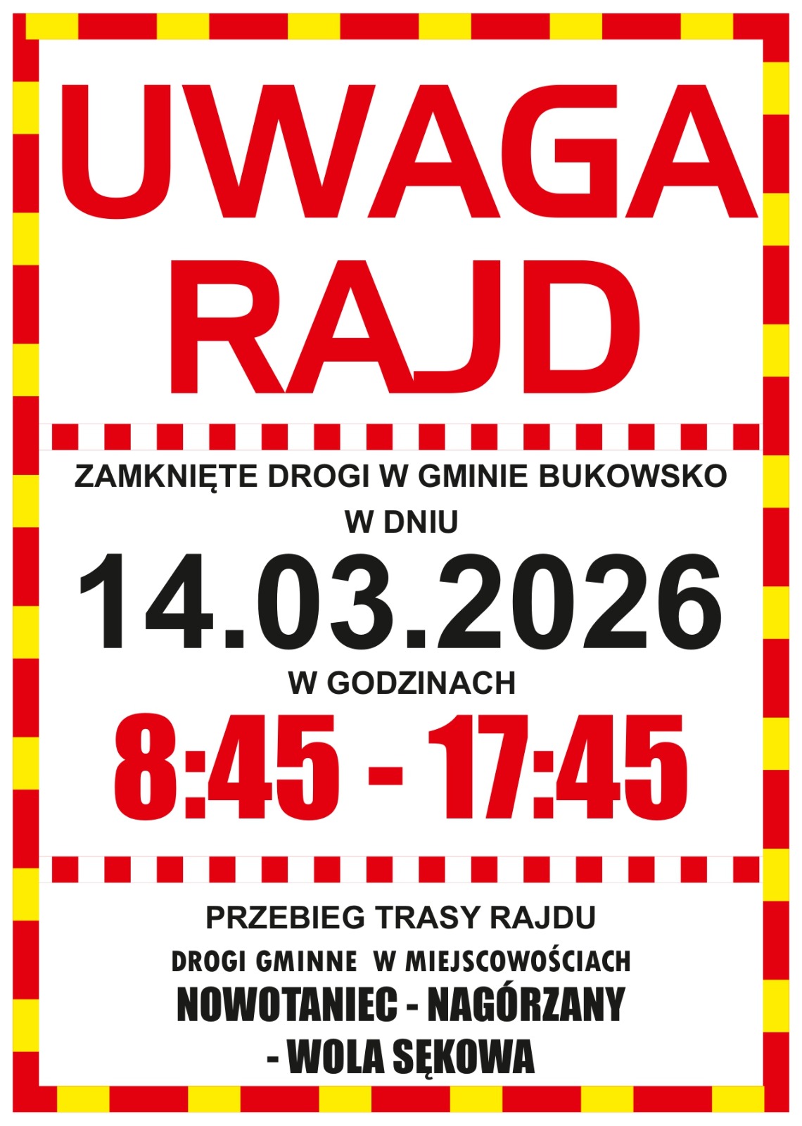W związku z organizacją wydarzenia na wybranych drogach wystąpią czasowe utrudnienia w ruchu oraz zamknięcia dróg, związane z przejazdem zawodników na odcinkach specjalnych.