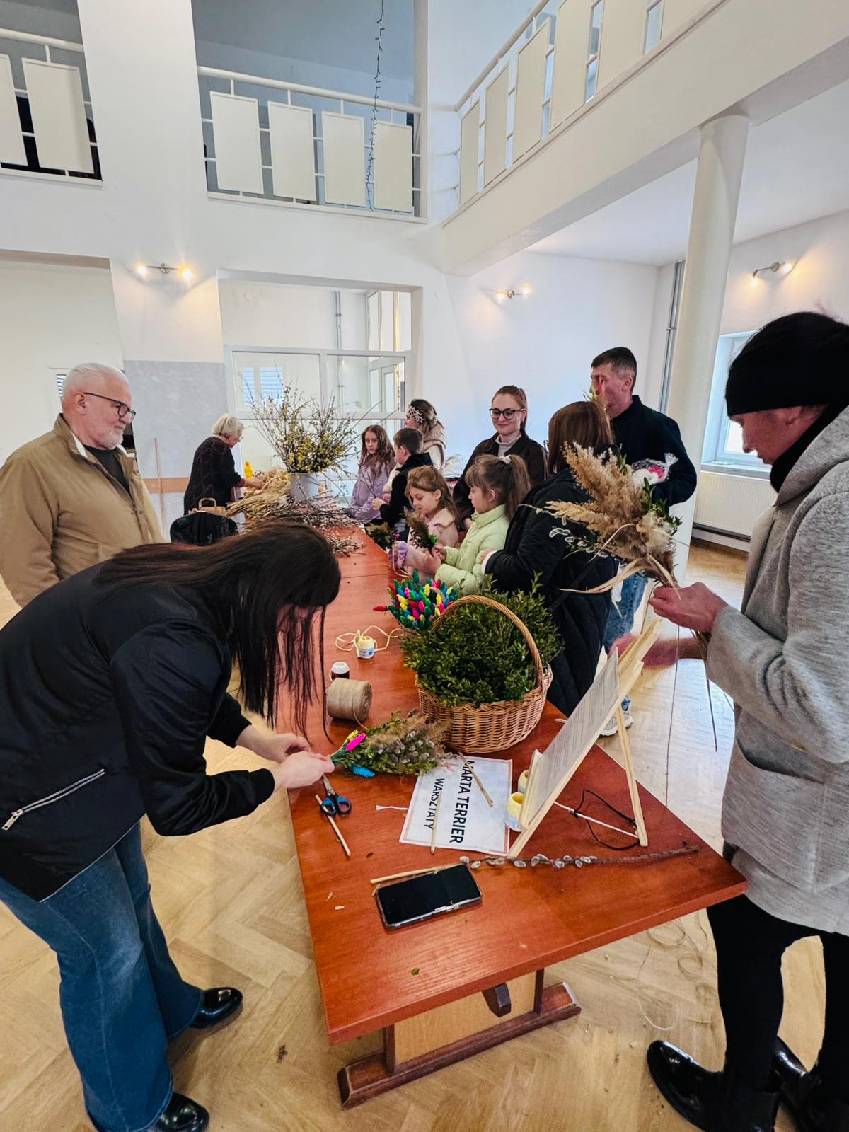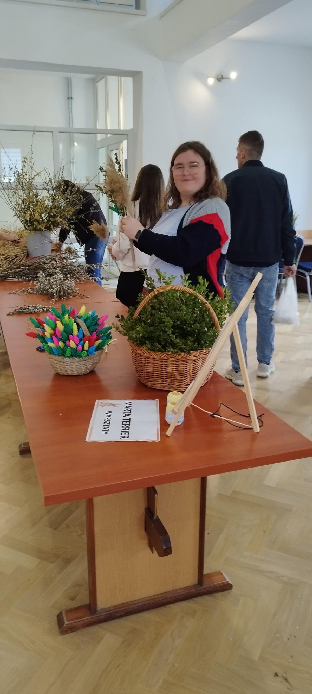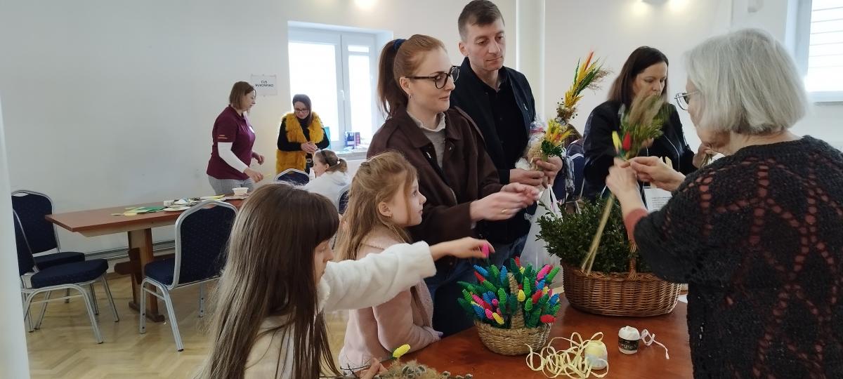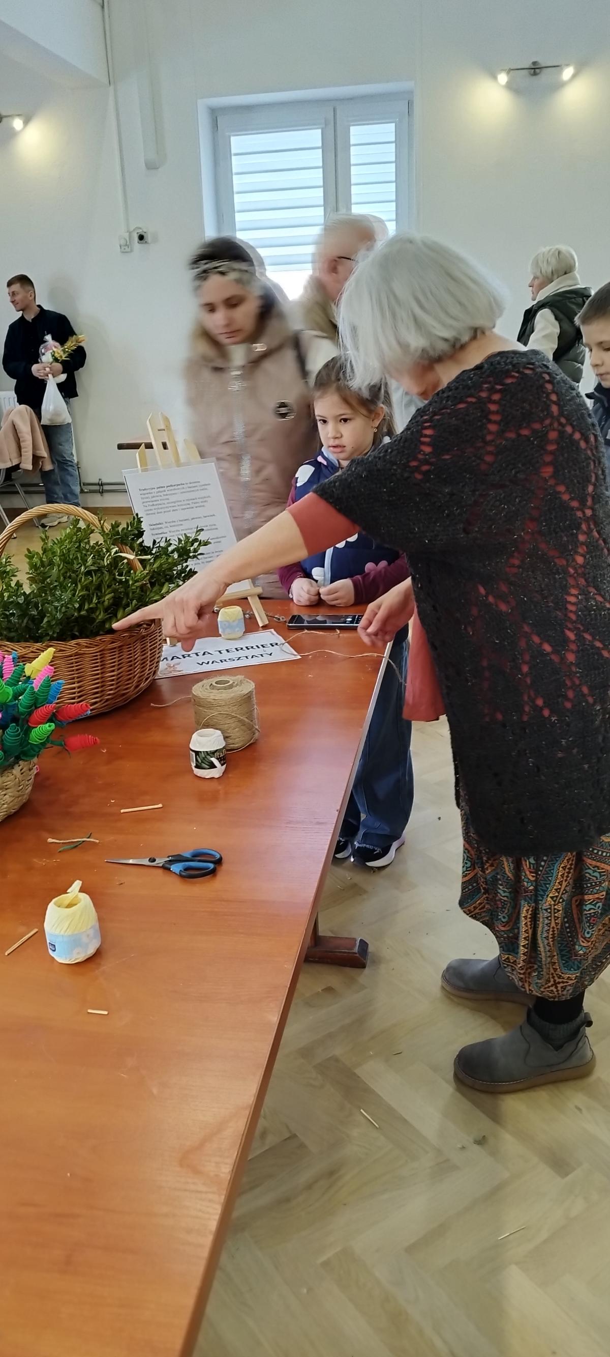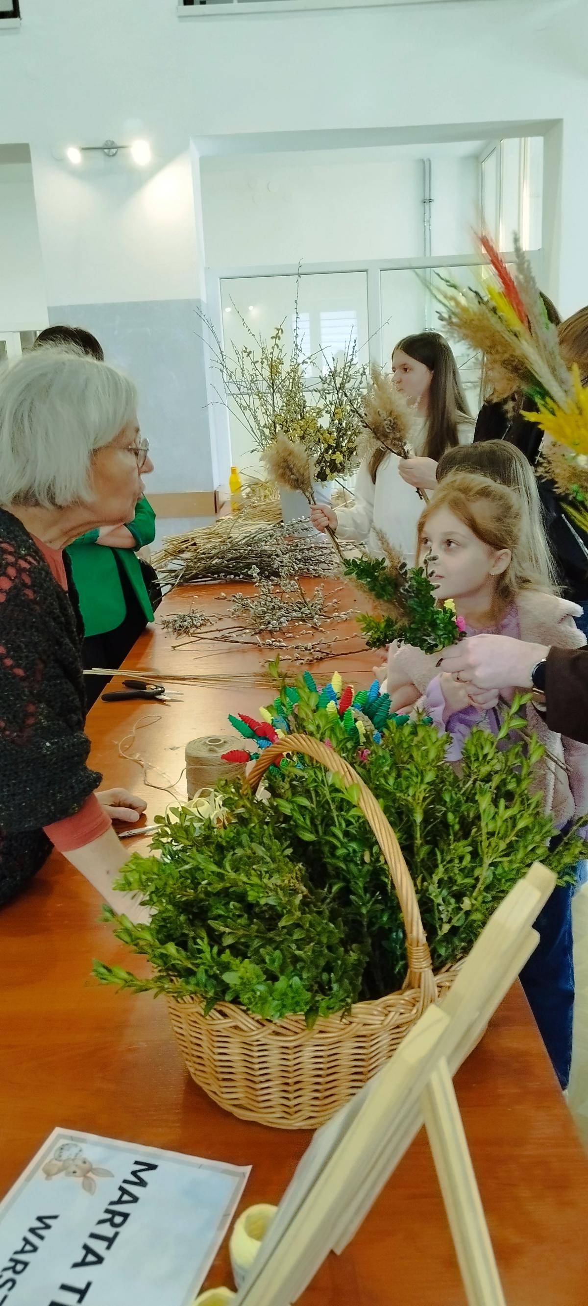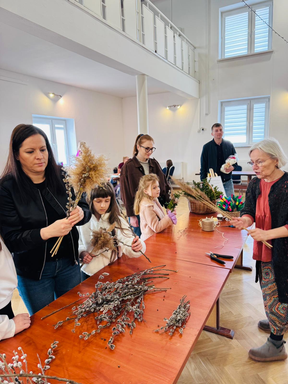Pięknym akcentem były warsztaty tworzenia tradycyjnych palm wielkanocnych z Panią Martą Terrier, które przyciągnęły zarówno najmłodszych, jak i starszych. Zaangażowali się tutaj nawet mężczyźni, którzy korzystając z podpowiedzi Pani Marty, czasem swoich dzieci, układali niepowtarzalne palmy.