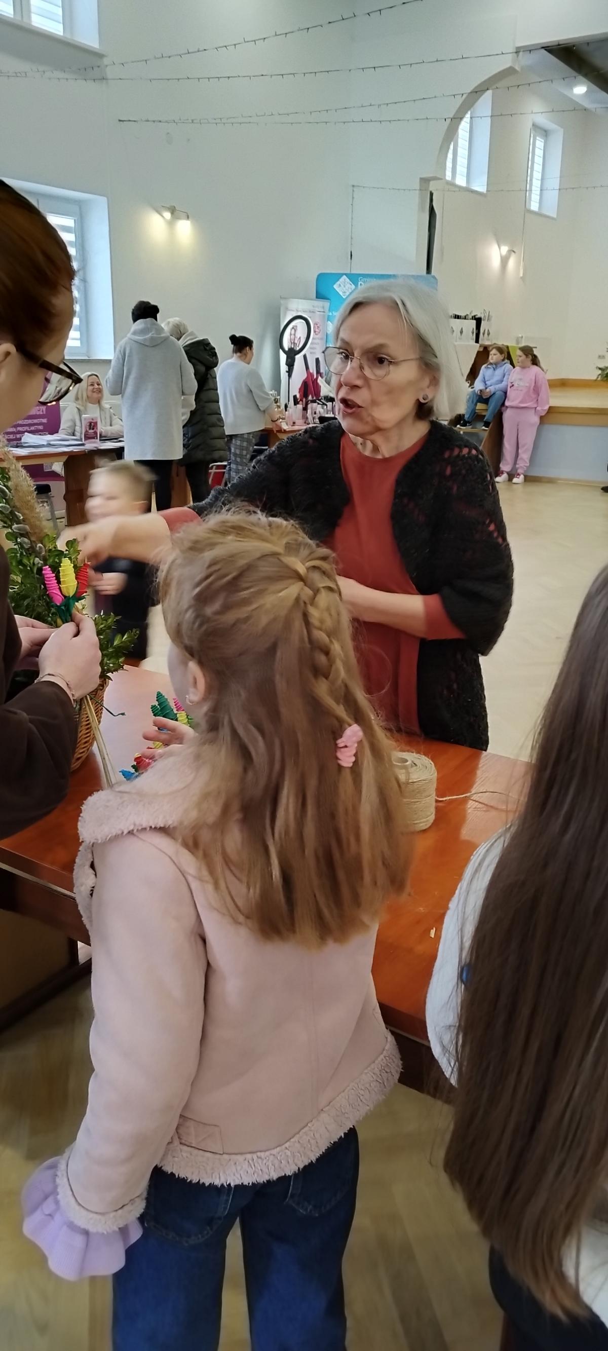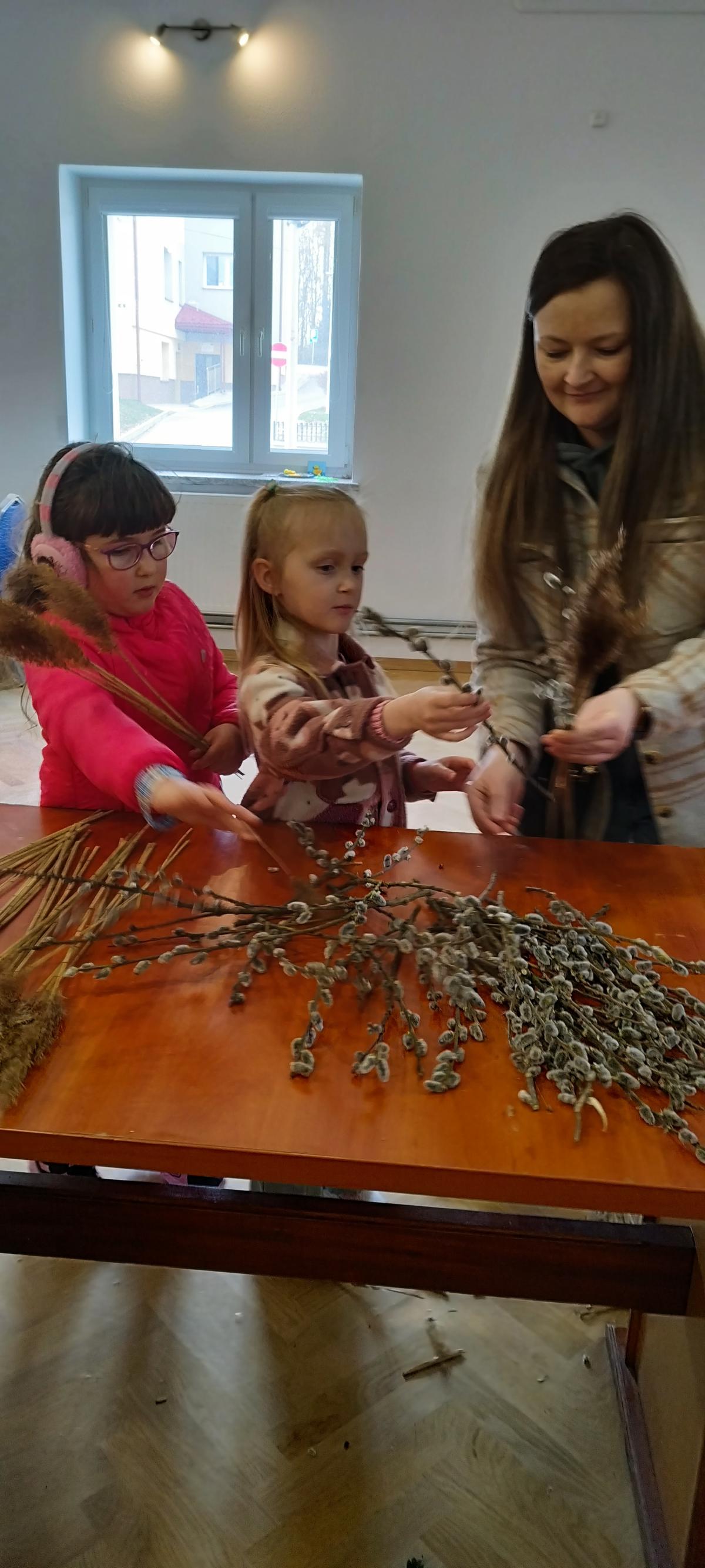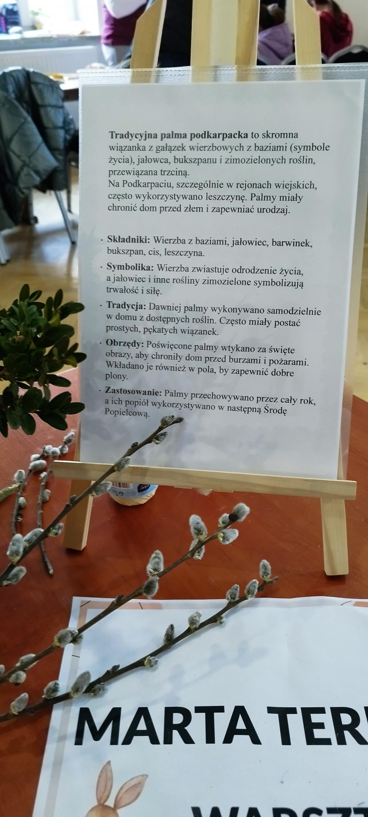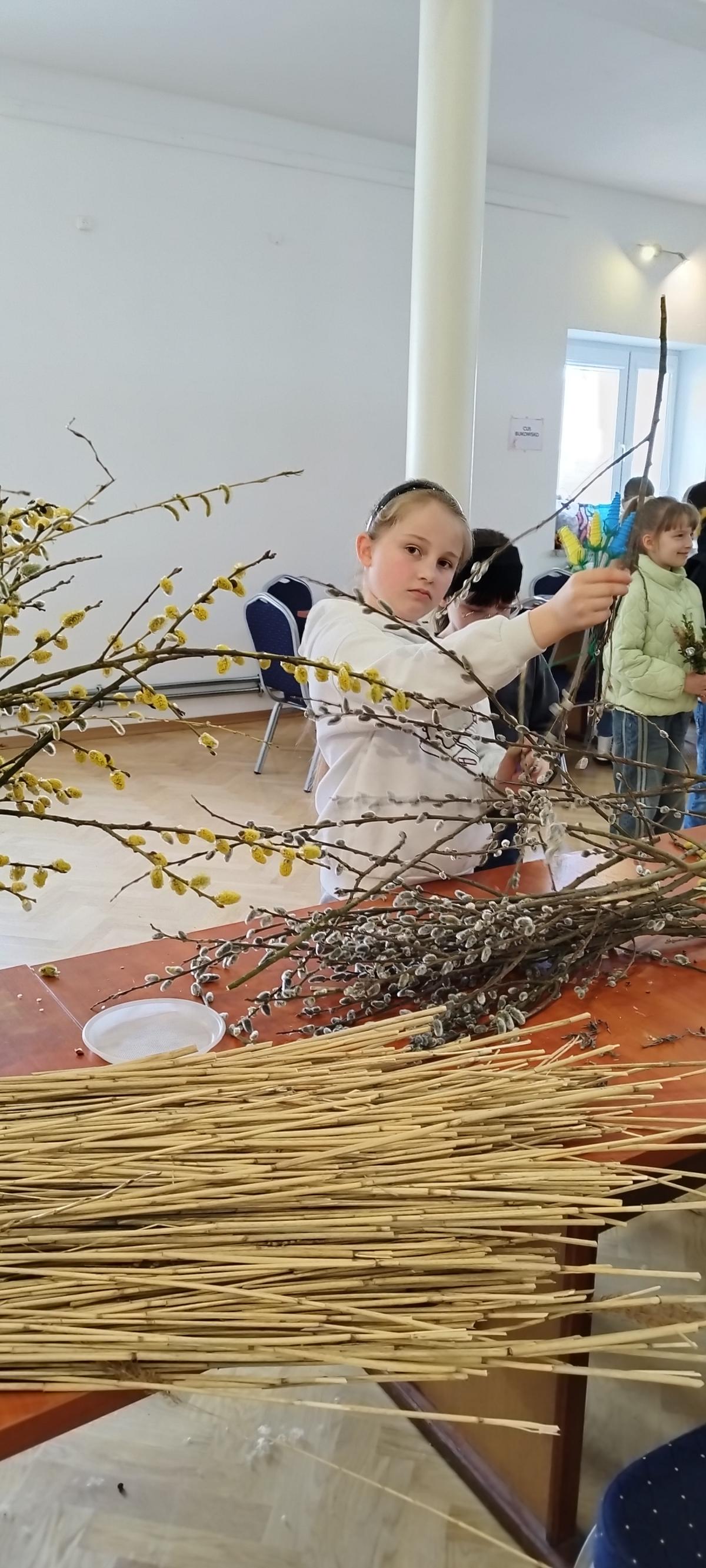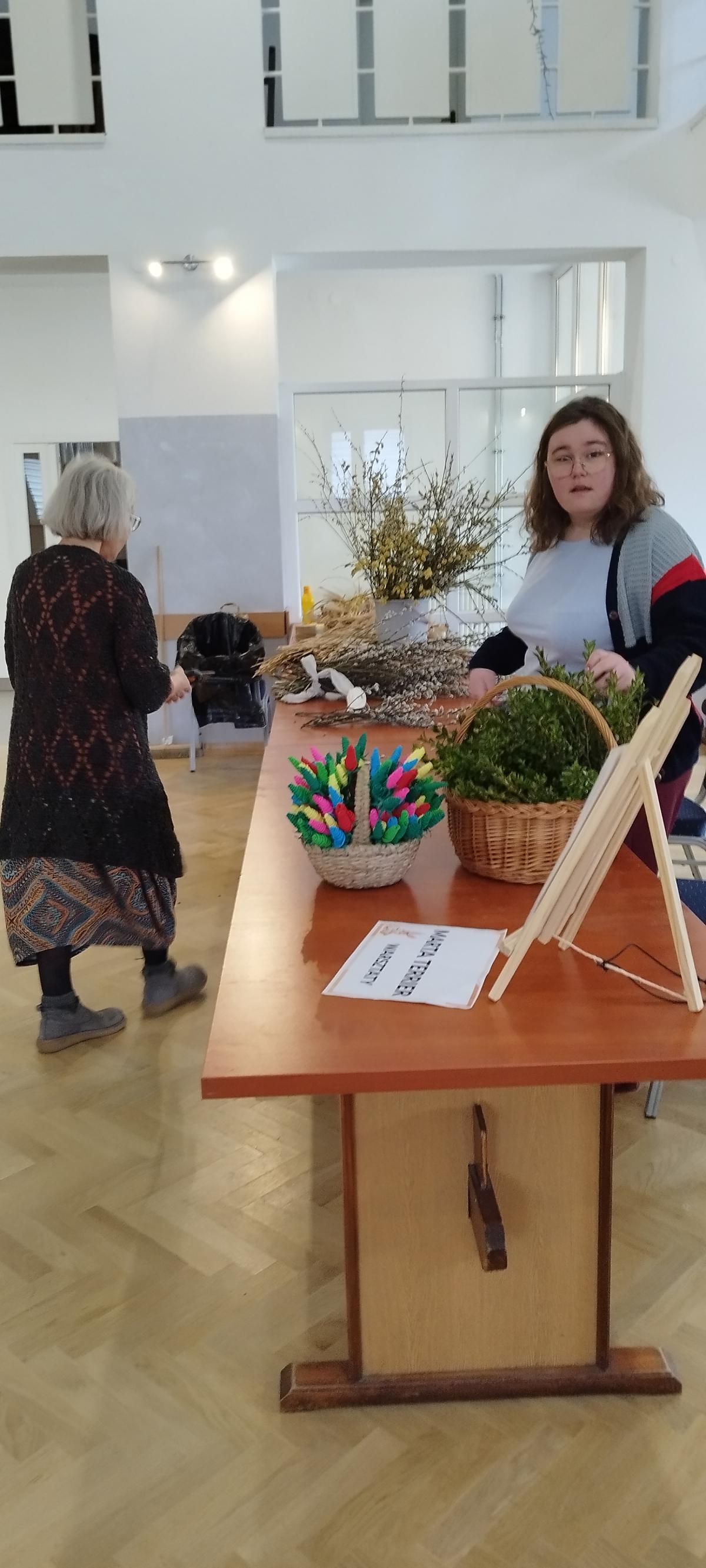 Pięknym akcentem były warsztaty tworzenia tradycyjnych palm wielkanocnych z Panią Martą Terrier, które przyciągnęły zarówno najmłodszych, jak i starszych. Zaangażowali się tutaj nawet mężczyźni, którzy korzystając z podpowiedzi Pani Marty, czasem swoich dzieci, układali niepowtarzalne palmy.