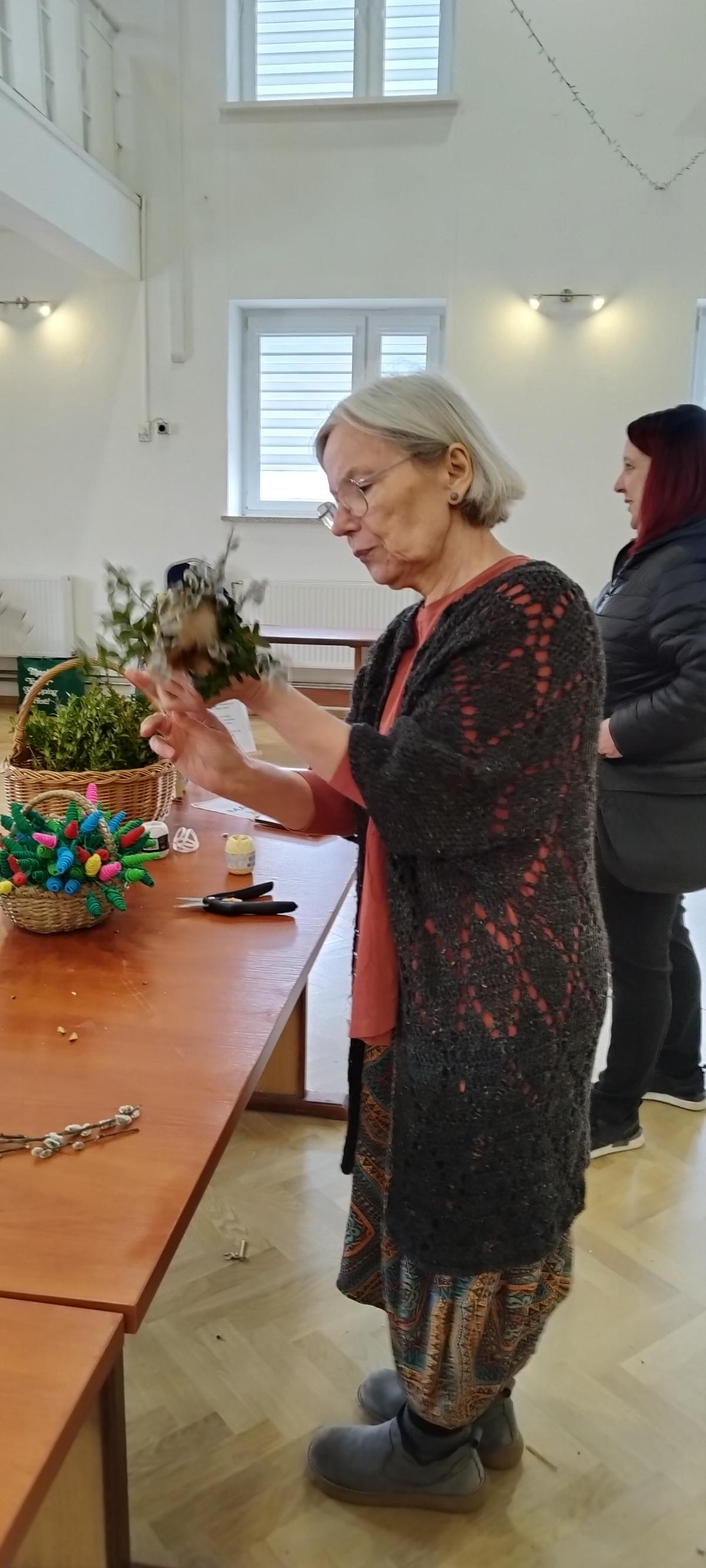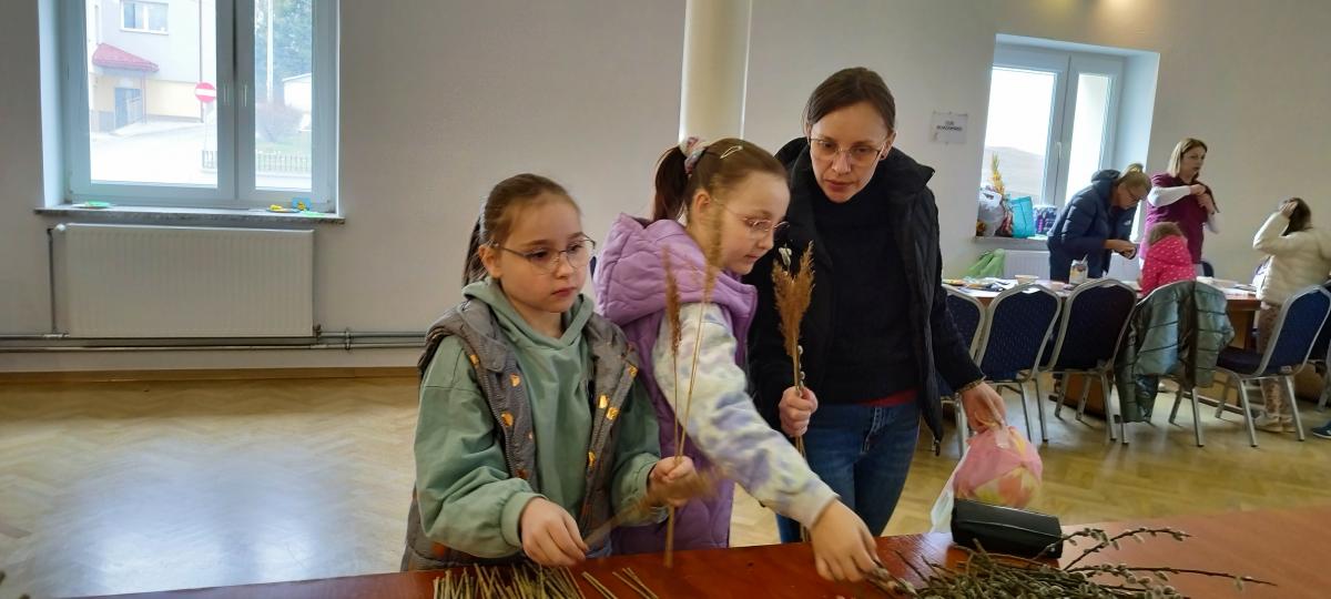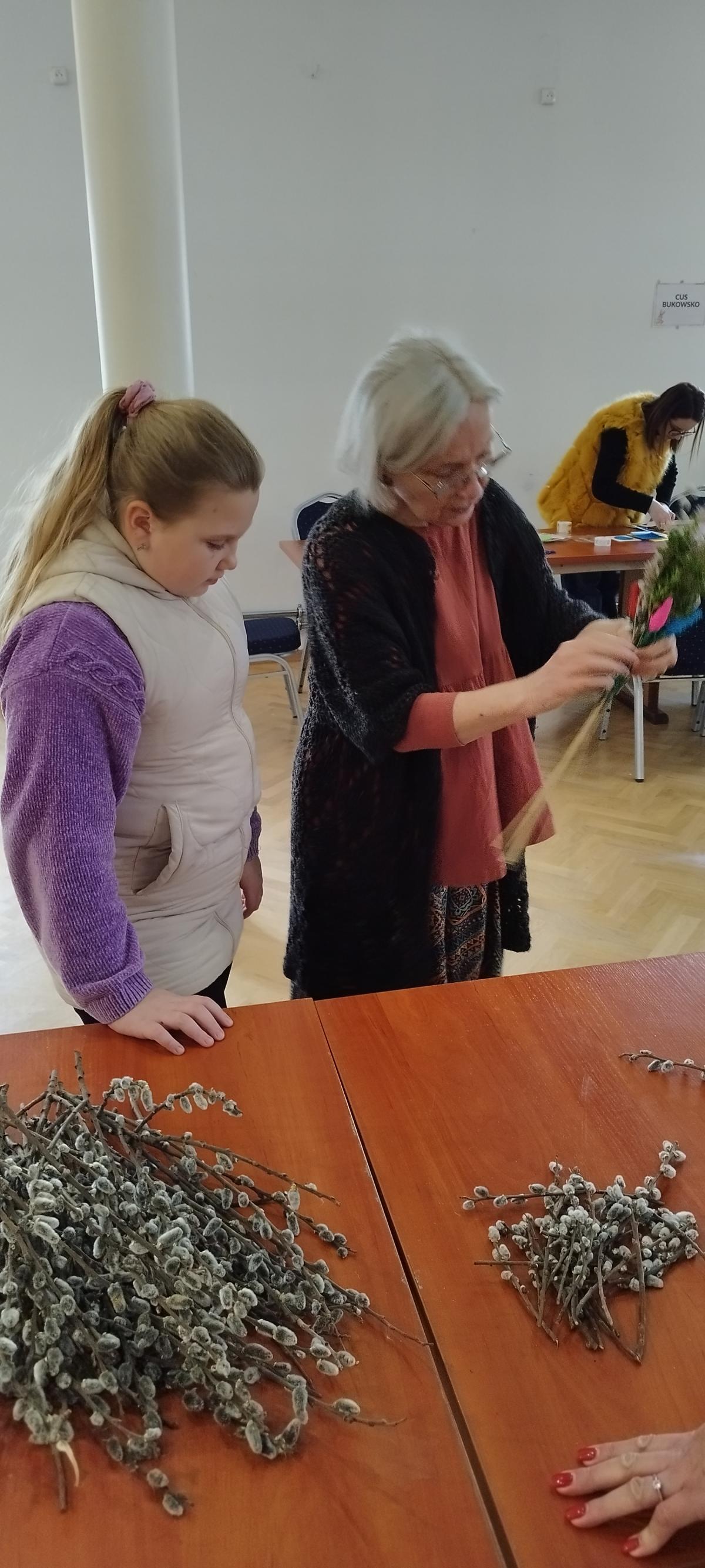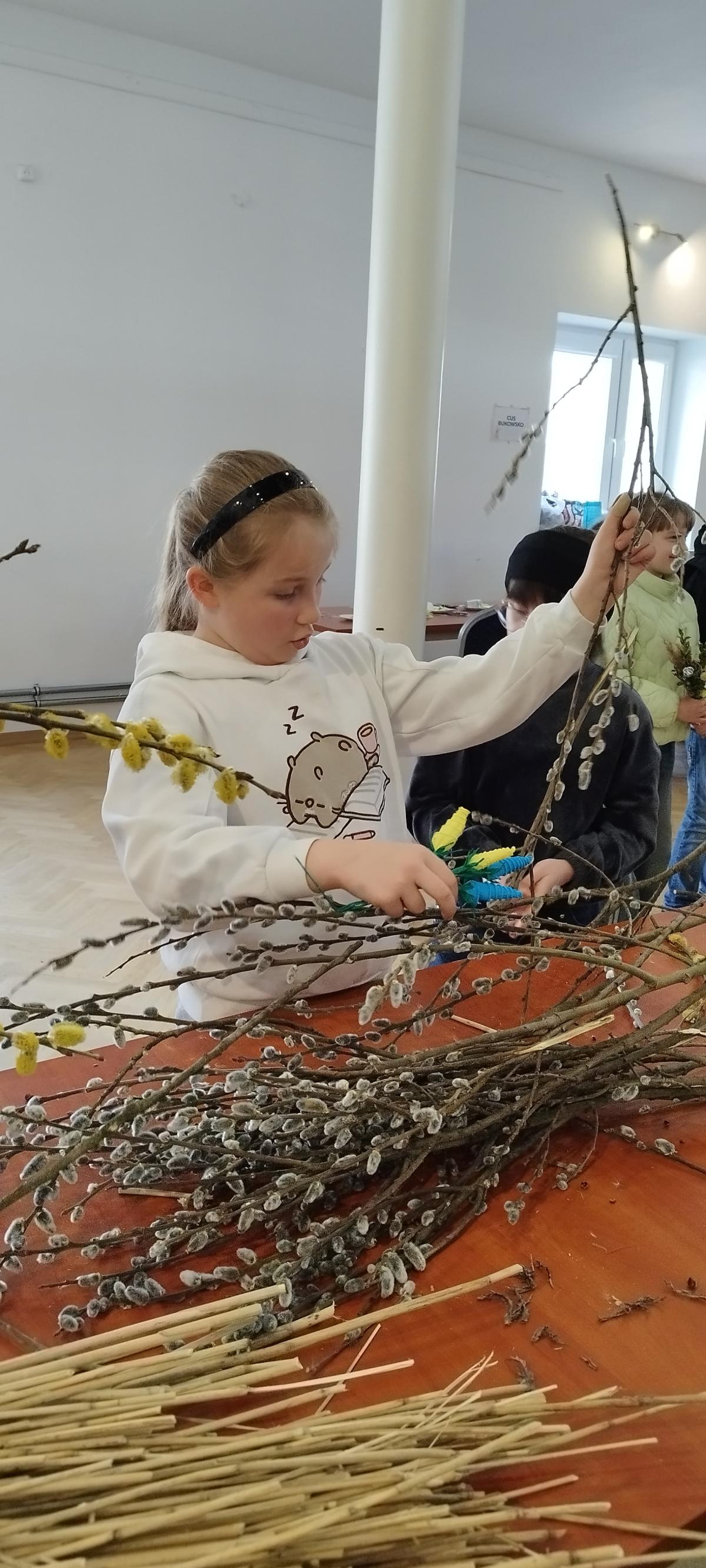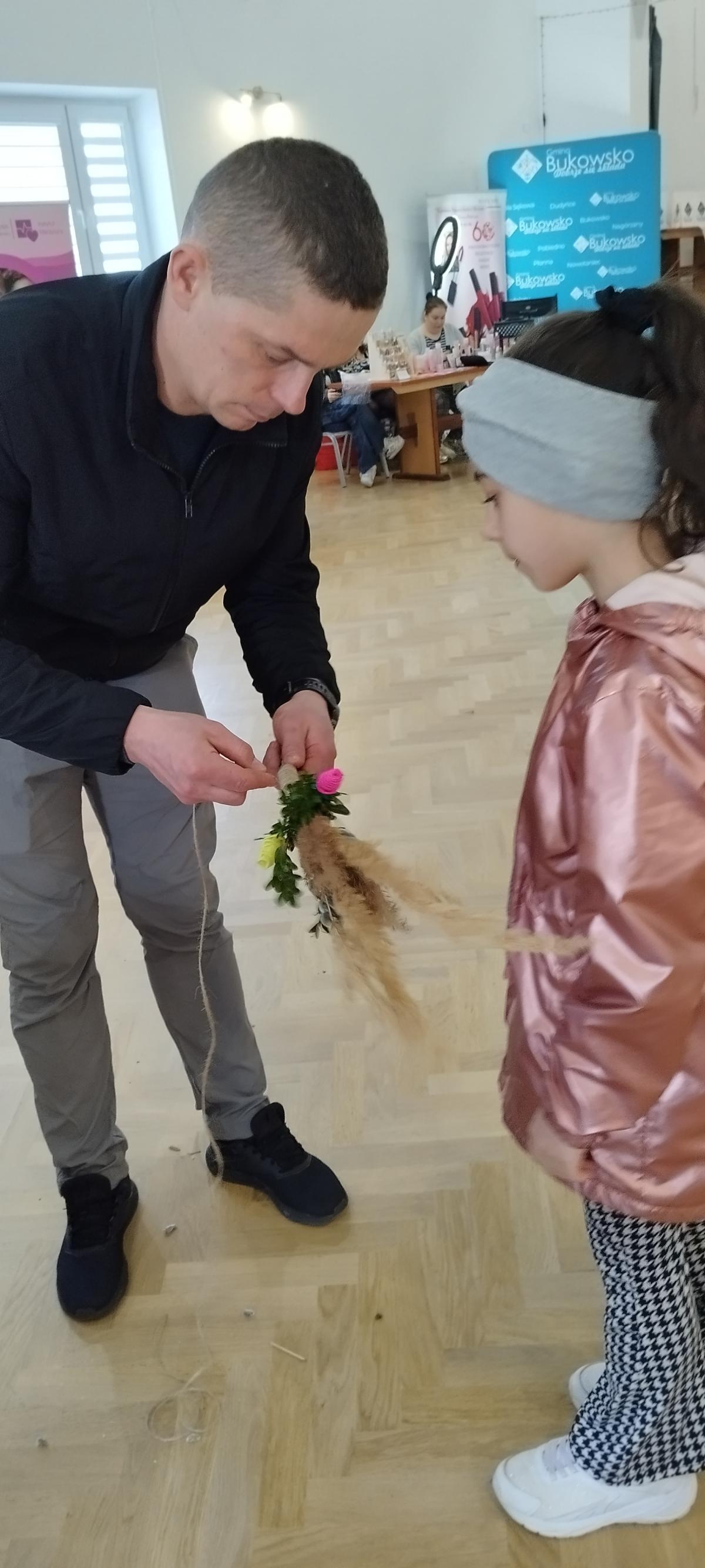 Pięknym akcentem były warsztaty tworzenia tradycyjnych palm wielkanocnych z Panią Martą Terrier, które przyciągnęły zarówno najmłodszych, jak i starszych. Zaangażowali się tutaj nawet mężczyźni, którzy korzystając z podpowiedzi Pani Marty, czasem swoich dzieci, układali niepowtarzalne palmy.