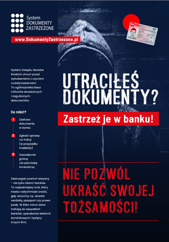 - Zastrzeżenie w Systemie Dokumenty Zastrzeżone – w swoim banku lub w dowolnym banku przyjmującym zastrzeżenia także od osób niebędących jego klientami.