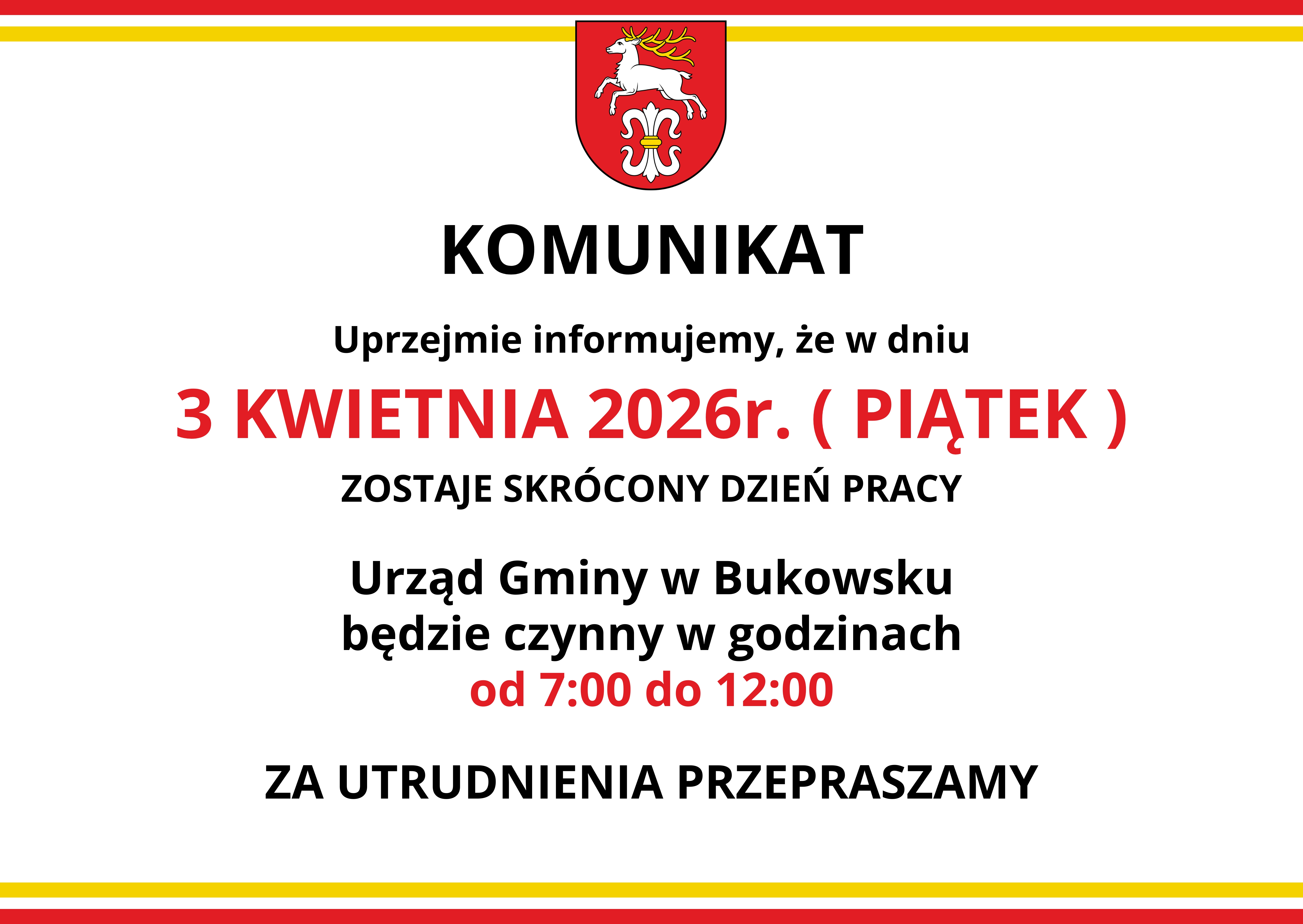 informujemy, że w dniu 3 kwietnia 2026 r. (Wielki Piątek) Urząd Gminy Bukowsko oraz Centrum Usług Społecznych będą czynne w godzinach od 7:00 do 12:00.