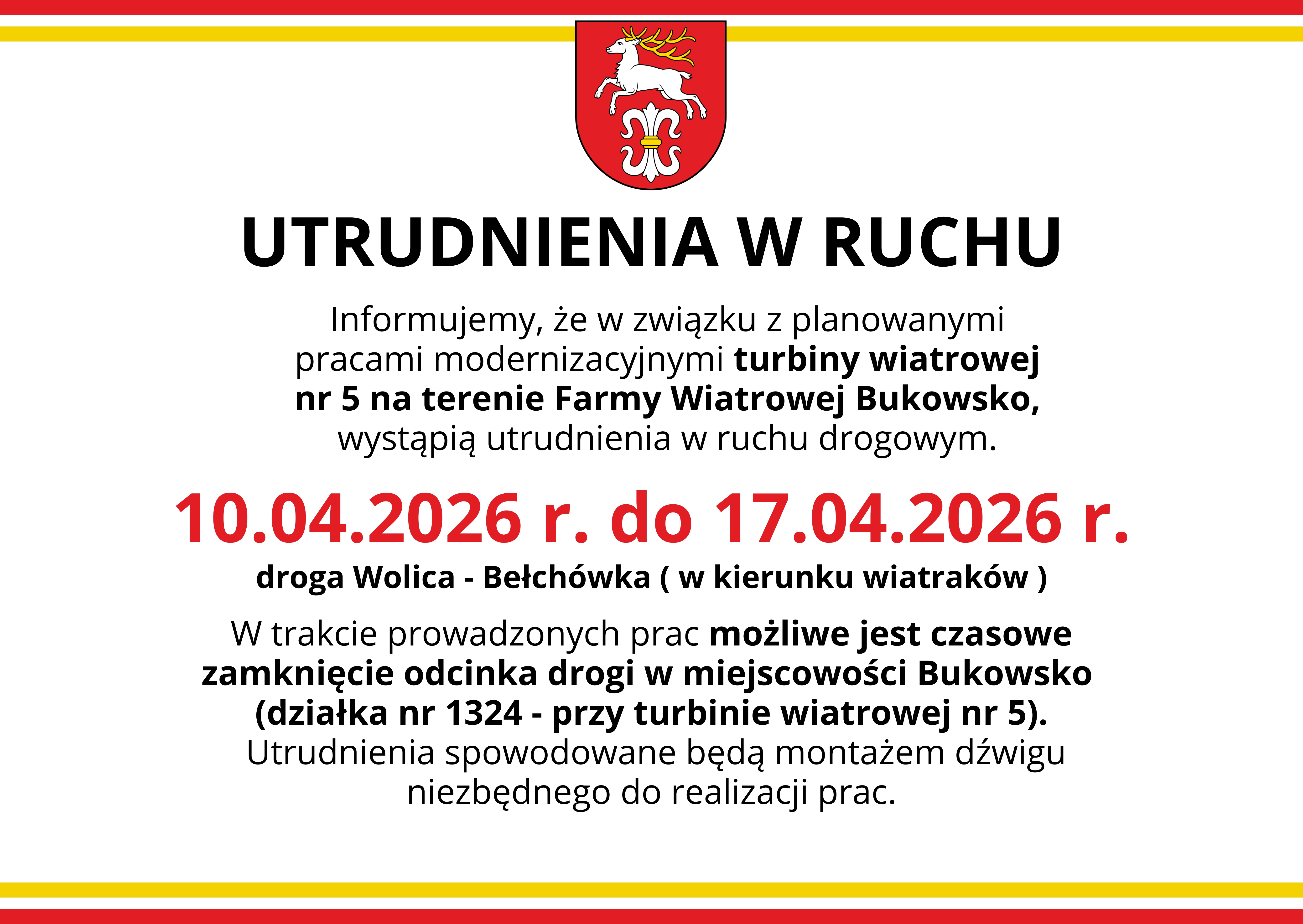 W trakcie prowadzonych prac możliwe jest czasowe zamknięcie odcinka drogi w miejscowości Bukowsko (działka nr 1324 - przy turbinie wiatrowej nr 5). Utrudnienia spowodowane będą montażem dźwigu niezbędnego do realizacji prac.