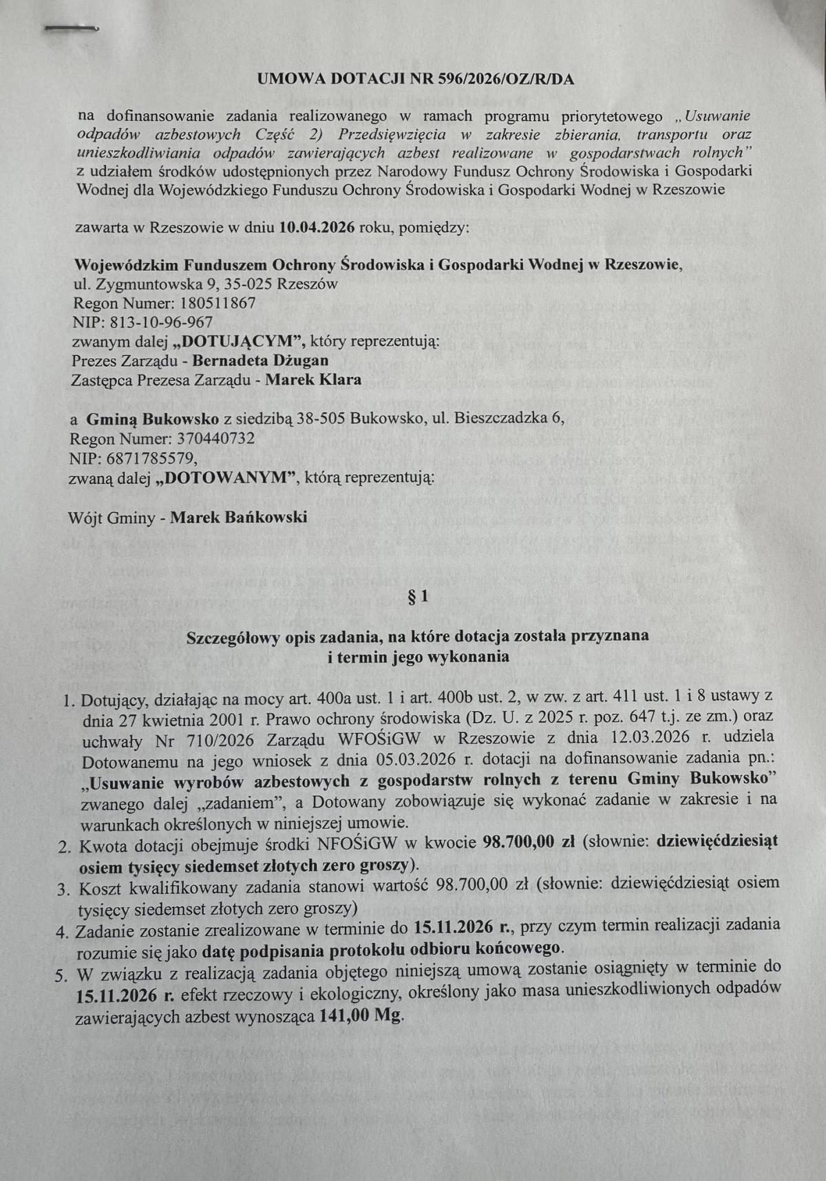 Projekt „Usuwanie wyrobów azbestowych z gospodarstw rolnych z terenu Gminy Bukowsko” zostanie zrealizowany przy wsparciu Narodowego Funduszu Ochrony Środowiska i Gospodarki Wodnej.