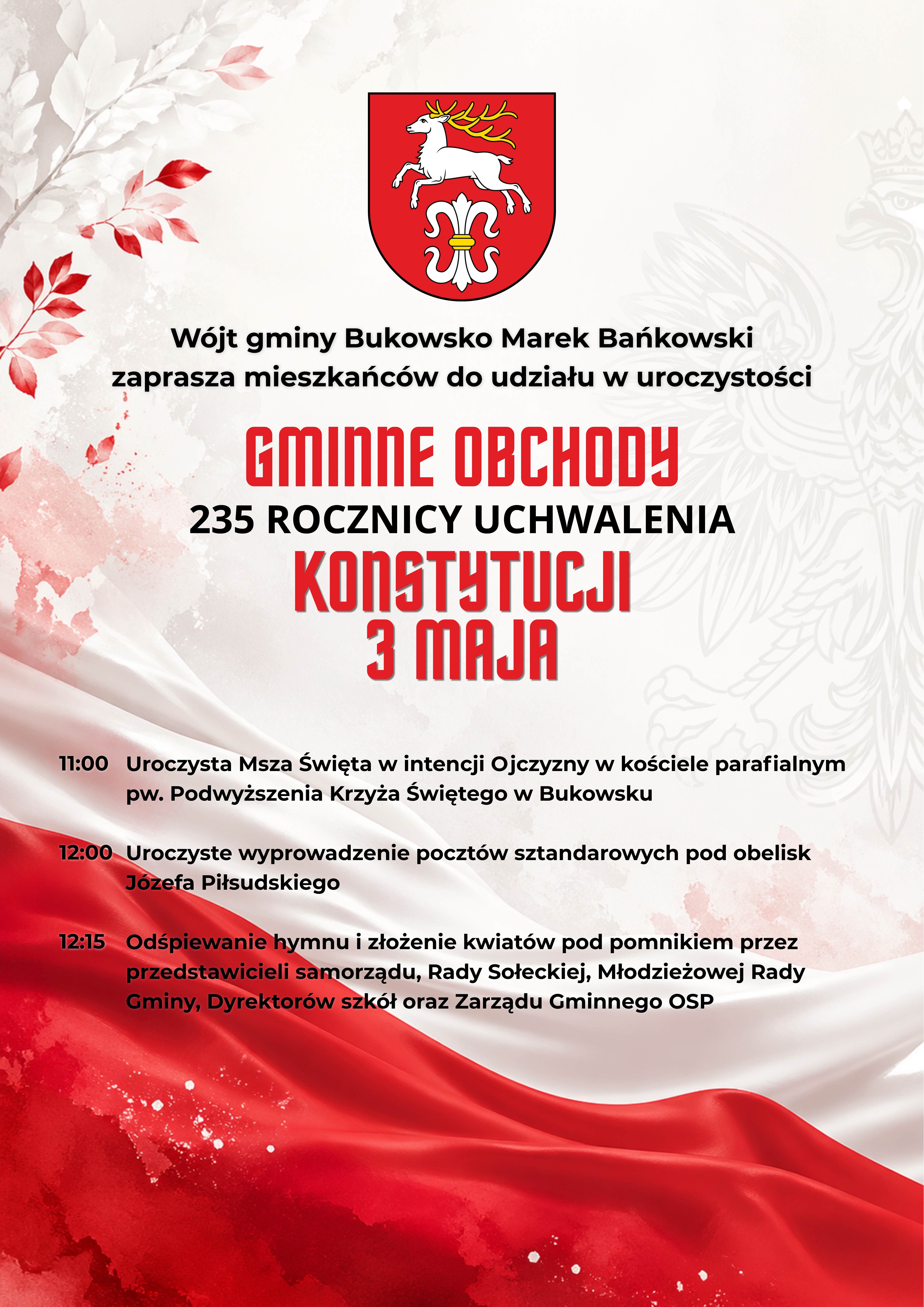 Wójt Gminy Bukowsko ma zaszczyt serdecznie zaprosić Mieszkańców Gminy oraz Gości na uroczyste Gminne Obchody 235. rocznicy uchwalenia Konstytucji 3 Maja.