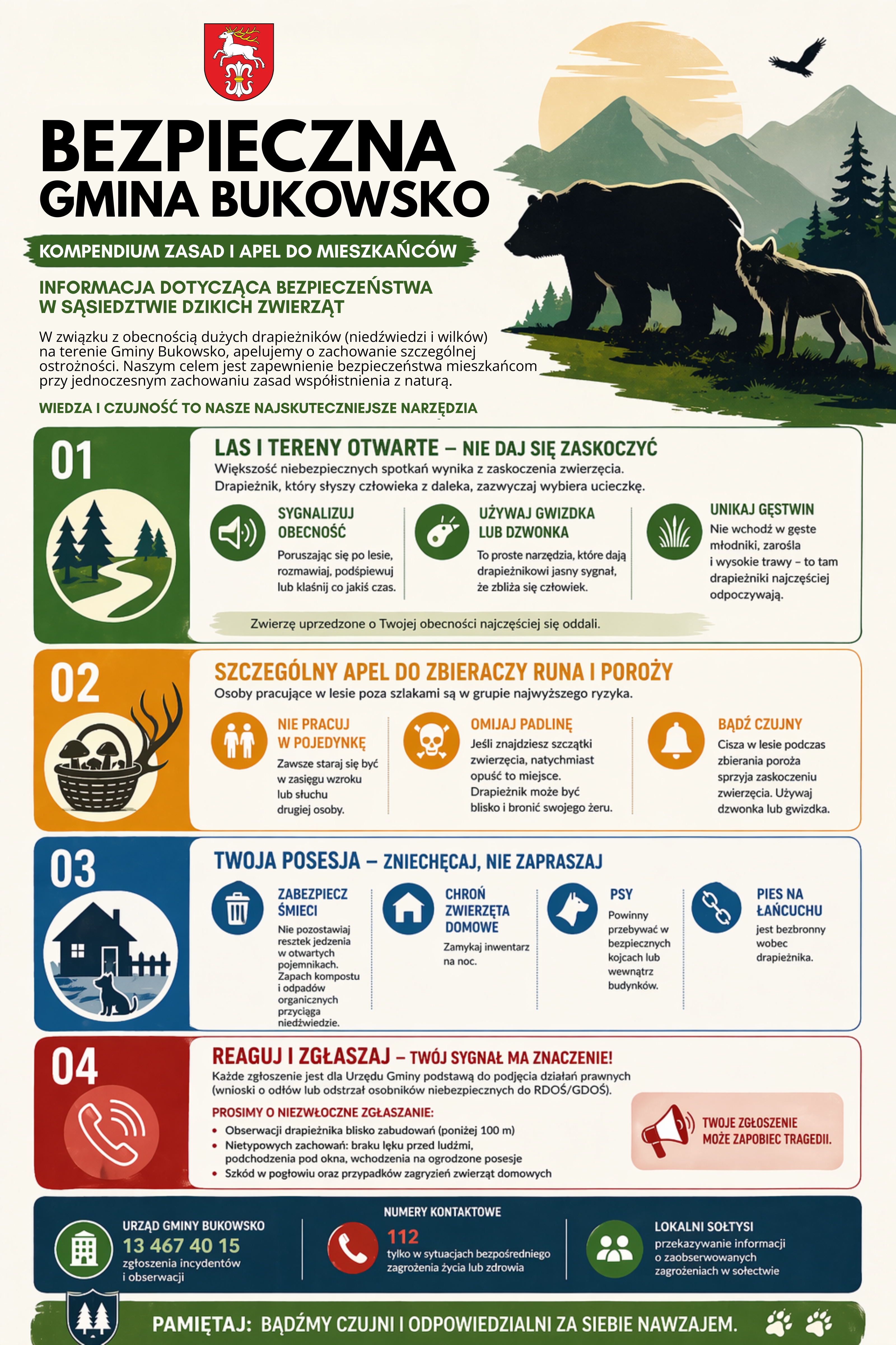 W związku z obecnością dużych drapieżników (niedźwiedzi i wilków) na terenie Gminy Bukowsko, apelujemy o zachowanie szczególnej ostrożności. Naszym celem jest zapewnienie bezpieczeństwa mieszkańcom przy jednoczesnym zachowaniu zasad współistnienia z naturą. Wiedza i czujność to nasze najskuteczniejsze narzędzia.