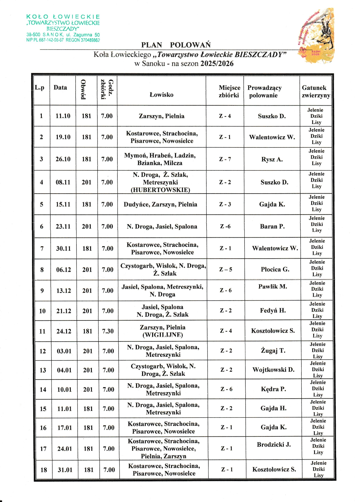 Plan polowań zbiorowych na terenie gminy Bukowsko w sezonie łowieckim 2025/2026